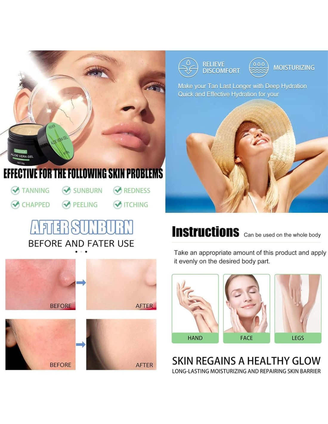 Crema Aceleradora de Bronceado para un color de sol extremo y gel bronceador brillante dorado para un bronceado profundo con un impresionante brillo dorado. Es muy adecuado para aquellos que les gusta ir a la playa a tomar el sol. Gel de Aloe Vera para aliviar quemaduras solares, ayuda a reponer la humedad en la piel seca, fórmula no grasa mantiene tu piel suave y tersa, repone la humedad perdida debido a los efectos secantes del sol, viento y agua. Nuestro gel de aloe vera calmará y enfriará tu piel después de la exposición al sol. Su fórmula natural y suave alivia la irritación de la piel y nutre la piel seca. Tiene propiedades refrescantes y calmantes para ayudar a reducir el enrojecimiento y la inflamación. Proporciona un equilibrio de hidratación y luminosidad a tu piel. Nuestro gel de aloe nutritivo y refrescante ayuda a mantener el equilibrio natural y los niveles de pH de la piel. Ayuda a reducir la sequedad y la descamación, dejando la piel suave y flexible. Ayuda a restaurar el equilibrio natural y la hidratación de la piel. Proporciona hidratación intensa para un cutis firme y flexible. Es ligero y de rápida absorción y es adecuado para todo tipo de piel. El uso regular calma la piel dejándola suave y flexible con un brillo saludable.