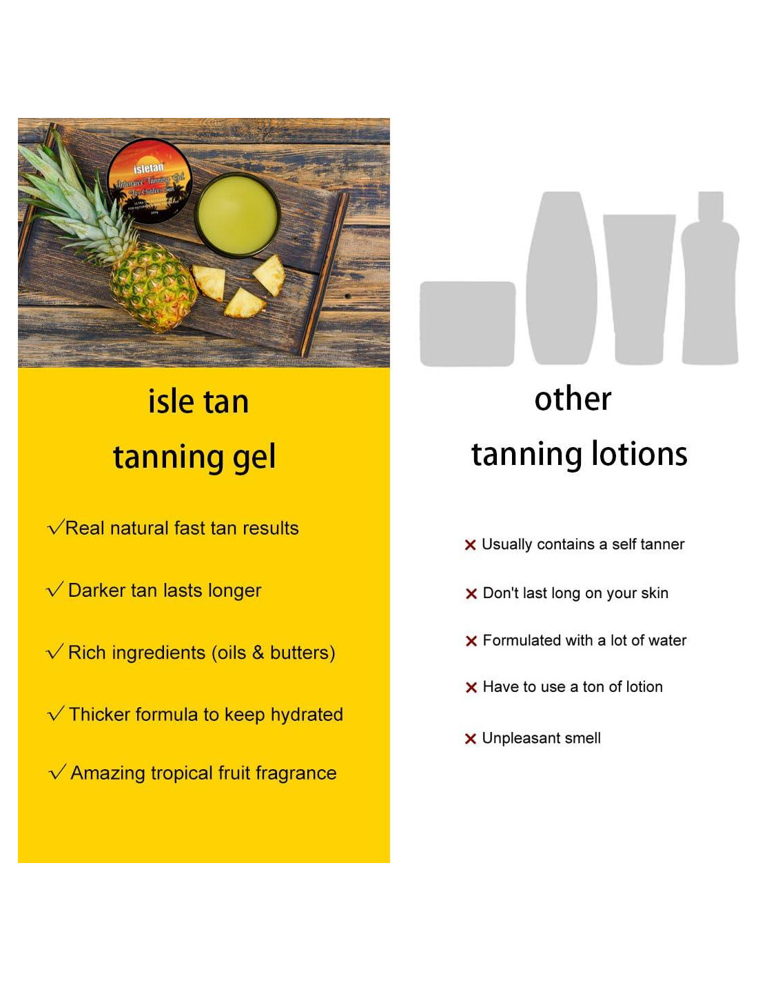 - Natural y Vegano y Libre de Crueldad. El acelerador de bronceado isletan para camas de bronceado y acelerador de bronceado para vacaciones no toma atajos en brindarte lo mejor para tu piel. Nuestros productos contienen solo los finos ingredientes naturales y nutritivos amados por todo tipo de piel.