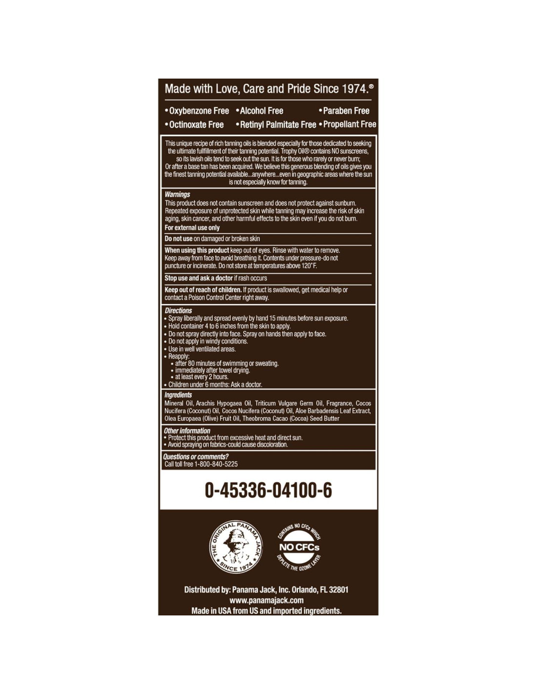 - NO CONTIENE PROTECCIÓN SOLAR: Con 0 SPF (Factor de Protección Solar), este aceite bronceador Panama Jack es mejor para usar solo después de haber obtenido un bronceado base y/o por tipos de piel que rara vez o nunca se queman
