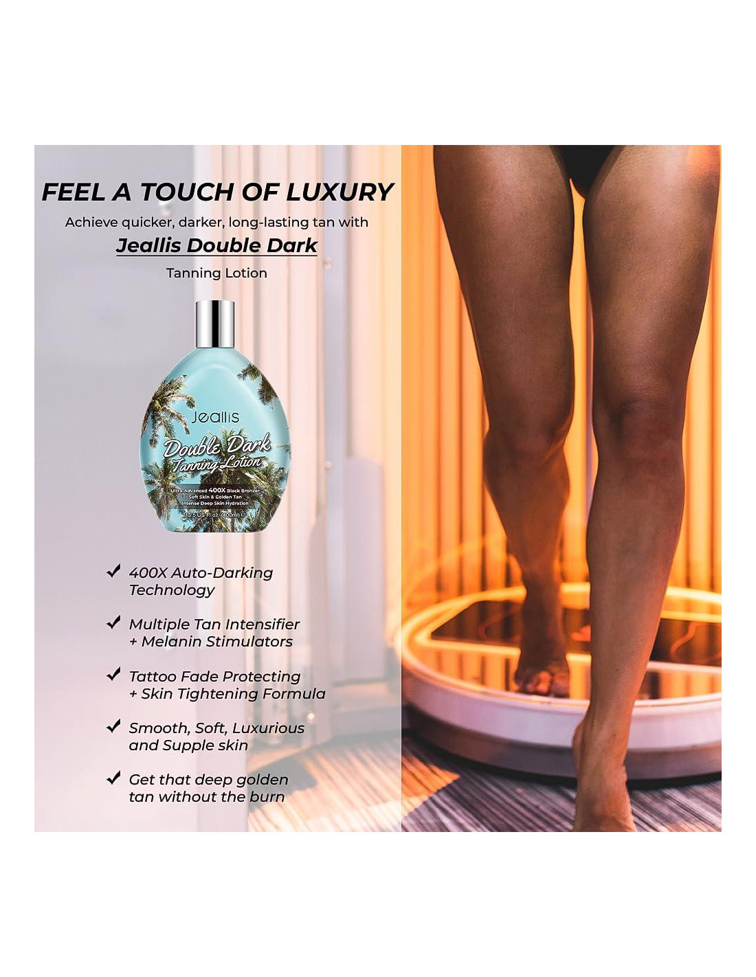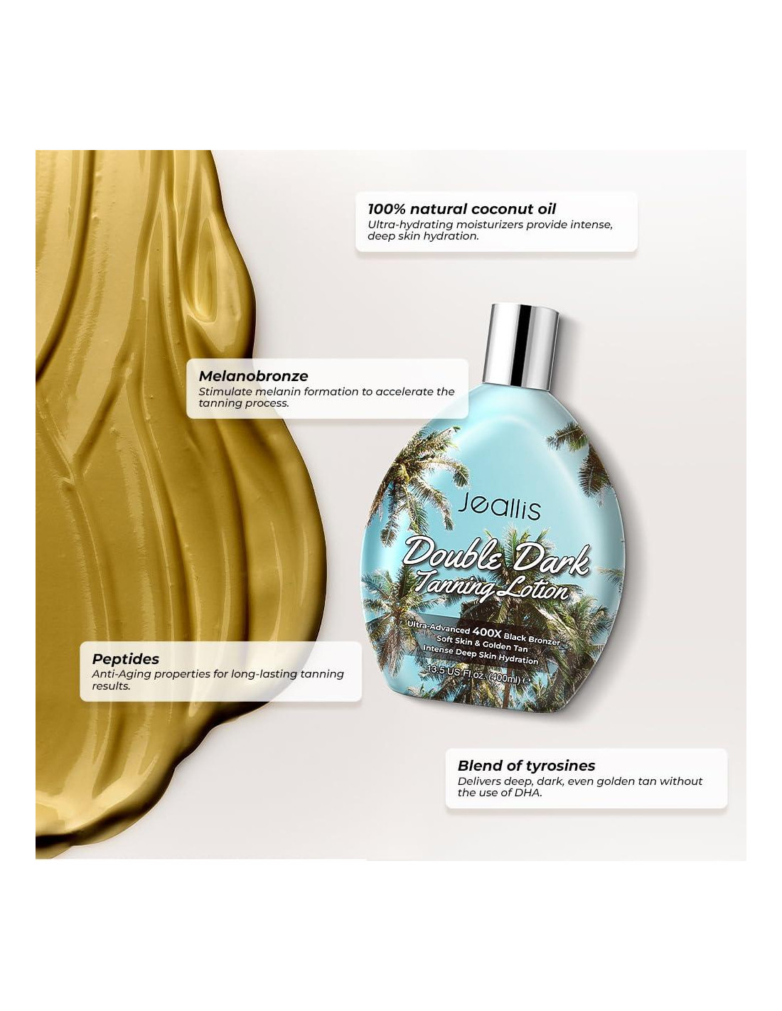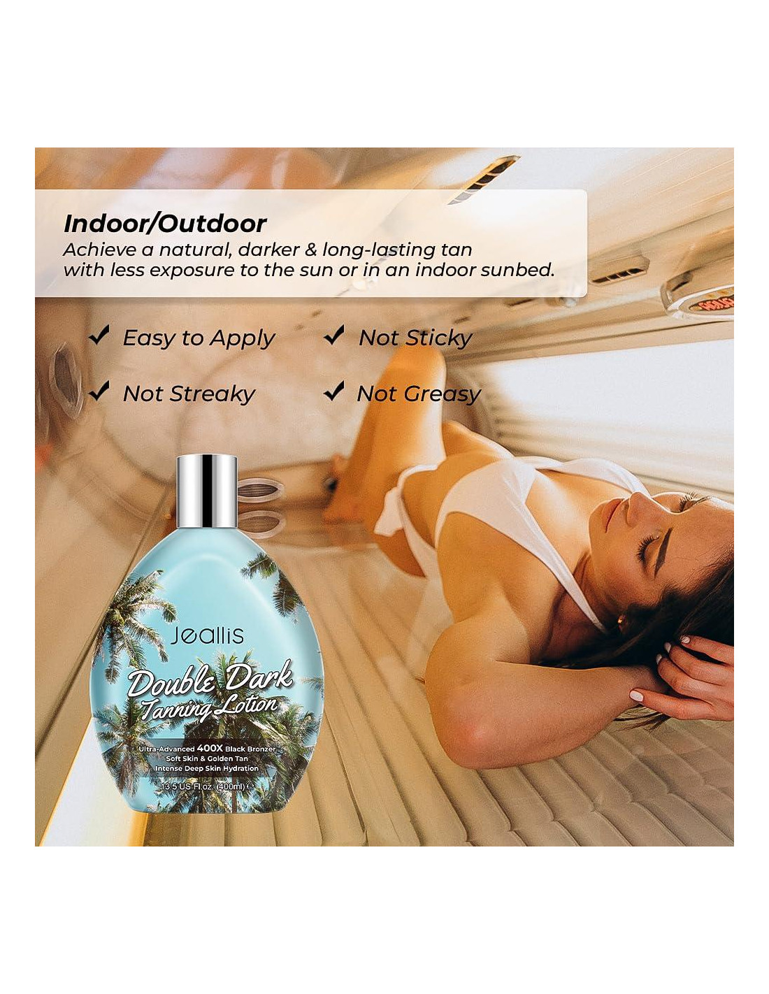 - Libre de DHA. La loción bronceadora para uso interior y exterior Jeallis acelera el proceso de bronceado mientras disfrutas del sol o usas una cama de bronceado, proporcionando resultados de brillo dorado natural sin el uso de DHA o procesos artificiales. La loción bronceadora activa la melanina en tu piel para que te broncees más rápido, pero no te vuelve naranja; el intensificador de bronceado para el sol y camas de bronceado solo te ayuda a alcanzar tu color bronceado natural.