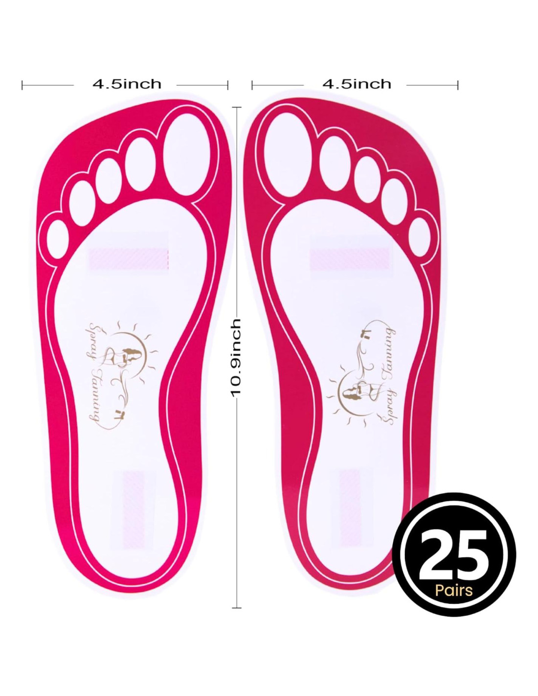 - Los pies miden 10.9 pulgadas (27,69 cm) de largo, por lo que una talla se adapta a todos. Vienen en un paquete de 25 pares. Pégalas para proteger los pies del cliente de absorber solución excesiva durante el rociado y para proteger su salón de manchas antiestéticas de bronceado.