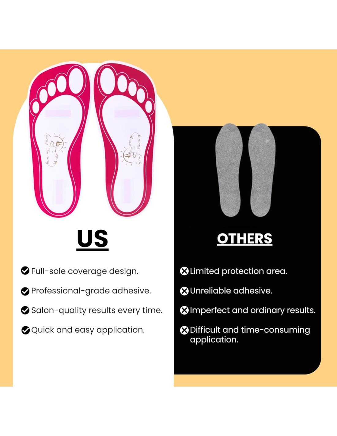 - Se adhieren a los pies: Estas almohadillas desechables de cartón se adhieren a las plantas de los pies para proporcionar un zapato higiénico y protector. Una gran alternativa a las chanclas, estos protectores de suela de alta calidad no cubren la parte superior de los pies de ninguna manera, asegurando que no interfieran con la aplicación del bronceado.