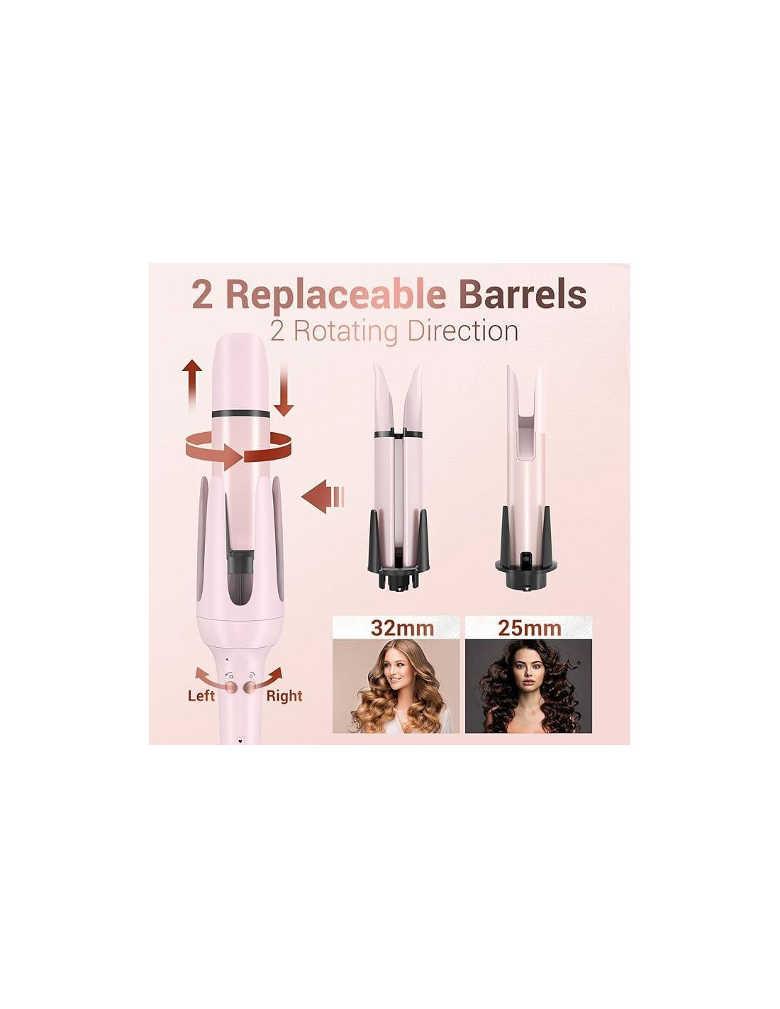 - 2 Varillas y 3 Temperaturas: Comparado con otros rizadores de cabello, nuestro rizador tiene 2 tamaños de varilla opcionales (2.54 cm/3.18 cm), 2 direcciones de rotación (Izquierda/Derecha) y 3 configuraciones de temperatura (165/190/210 C), que satisfacen mejor las diferentes necesidades para texturas de cabello y ocasiones.