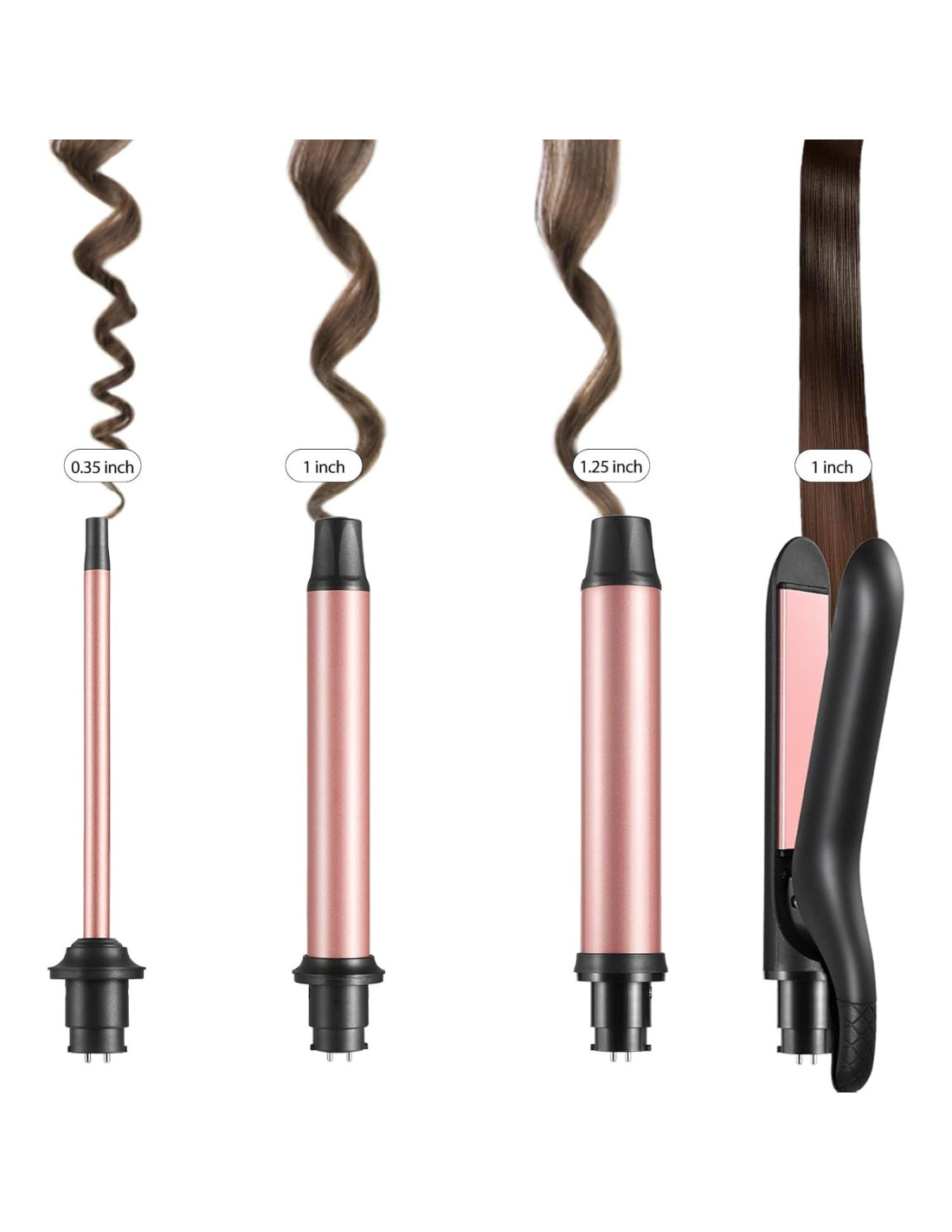 - Juego de Plancha de Rizar 4 en 1: Rizador de pelo con diferentes accesorios, incluyendo una plancha lisa de cerámica suave, varita de rizar pequeña de 3/8 pulgadas (0.95 cm), plancha de rizar de 1 pulgada (2.54 cm), plancha de rizar de 1 1/4 pulgadas (3.18 cm). Diferentes tamaños y formas de barriles de cerámica están disponibles para satisfacer varios requisitos de peinado. Con los rizos y la plancha lisa en un conjunto, ¡tienes cubierto un peinado!