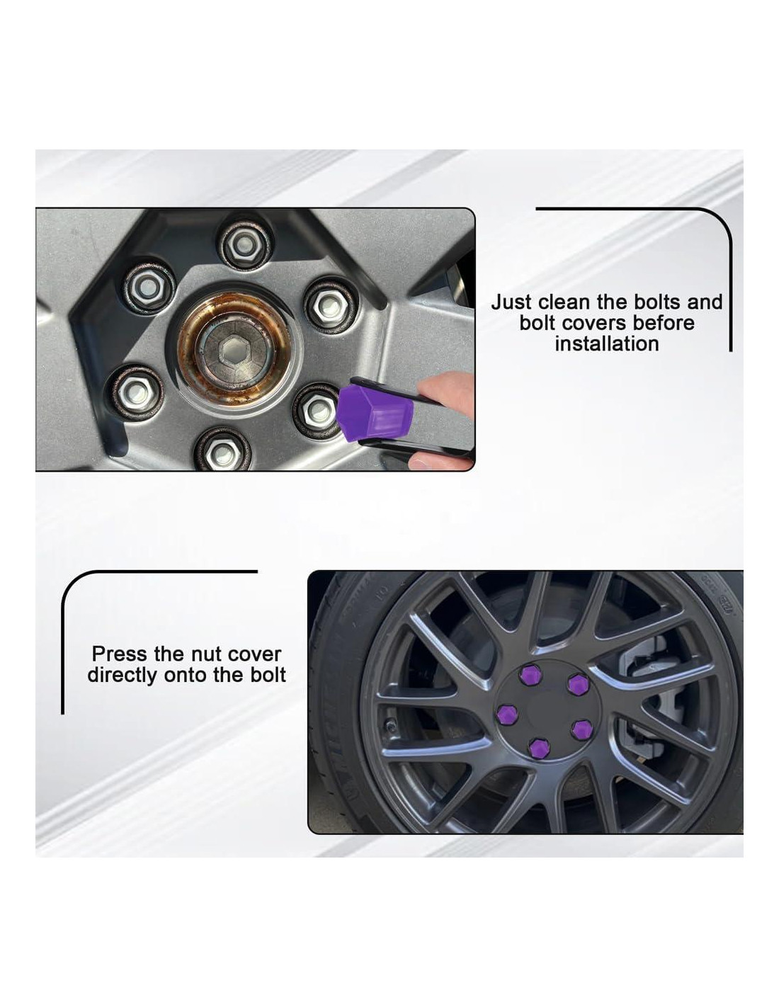 - [Fácil instalación]: Estas tapas de tornillos de rueda son simples en diseño y se pueden instalar fácilmente en su lugar. Por favor, limpie primero el tornillo de la rueda, luego presione el producto sobre el tornillo y compacte para asegurar un ajuste apretado, ahorrando tiempo y esfuerzo