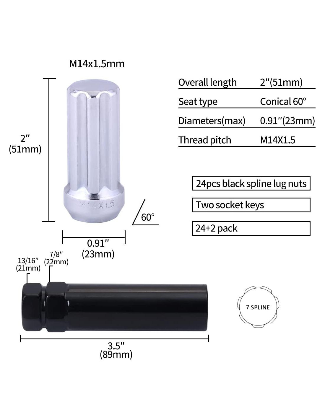 Producto incluido: 24 piezas de tuercas de rueda de cromo 7 spline; 2 piezas de llaves de socket