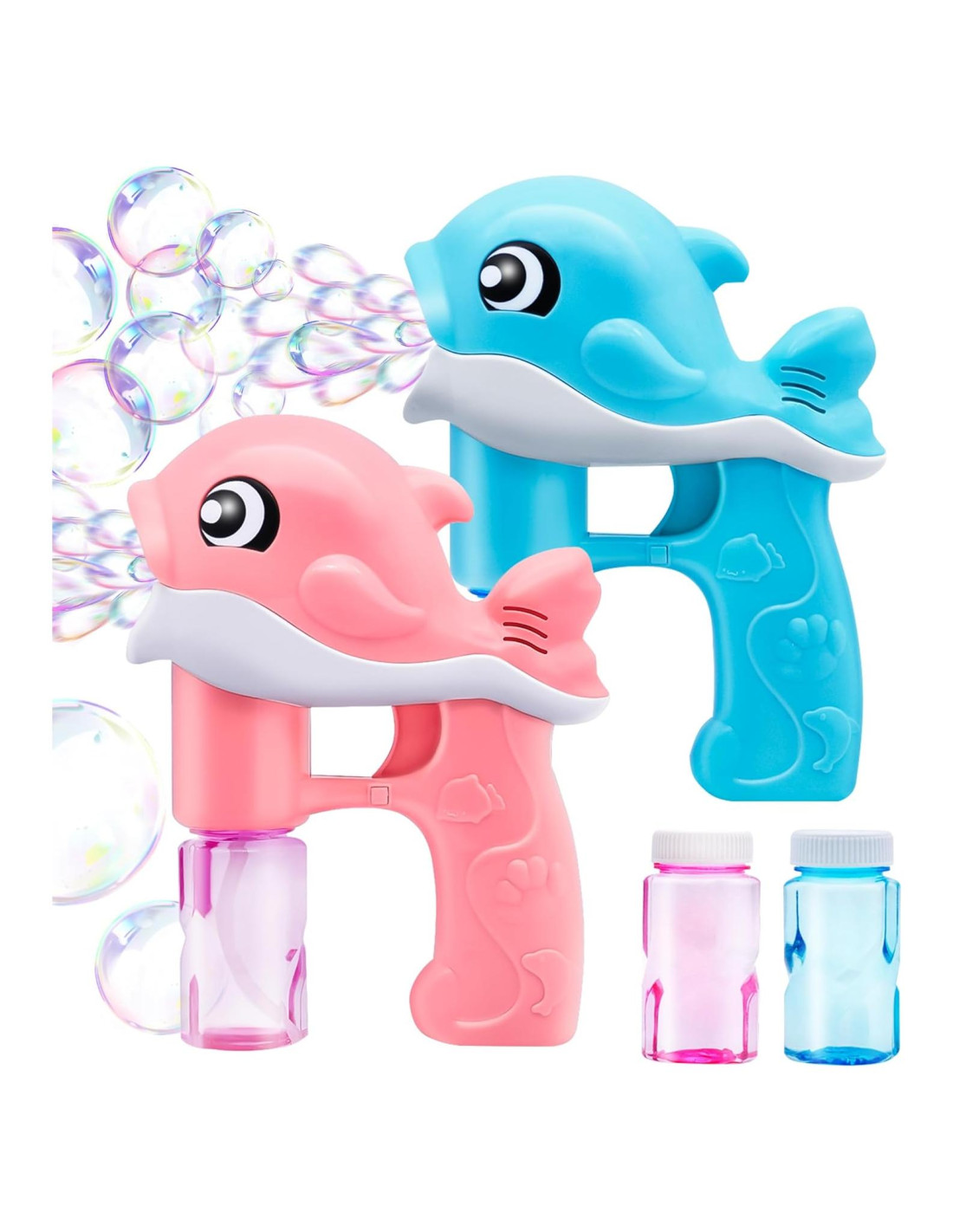 - PAQUETE DE SUPER VALOR. Nuestro Kit de Pistolas de Burbuja Incluye Dos Pistolas de Burbuja de Ballena (Rosa y Azul), Viene con 4 Botellas de 50ml de Soluciones de Burbuja.