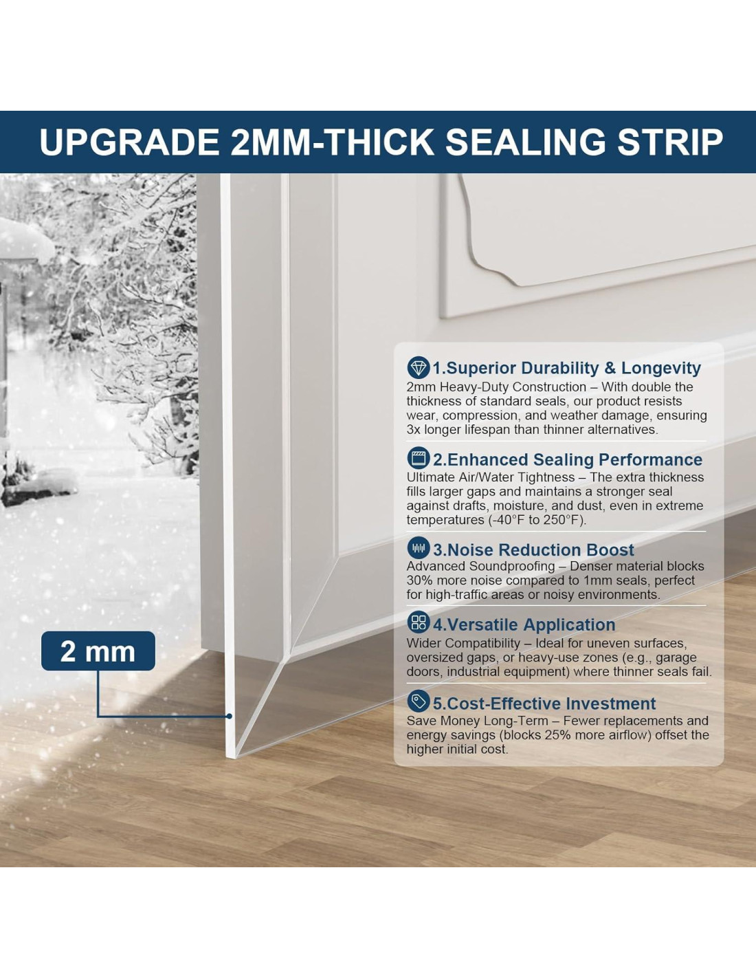 - Beneficios multifuncionales: Eficiencia energética: Bloquea el aire frío/caliente, reduciendo costos de calefacción y refrigeración. Protección para todo clima: Mantiene fuera el ruido, viento, agua y polvo para comodidad durante todo el año.