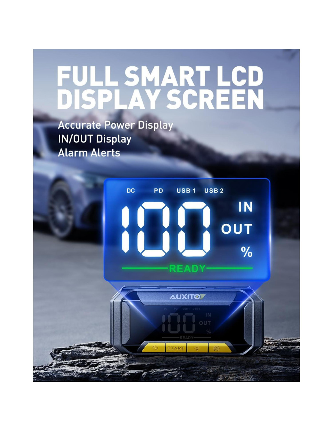 - Pantalla LCD Inteligente: El arrancador de batería de coche AUXITO cuenta con una pantalla LCD precisa que muestra el porcentaje de batería, voltaje y estado de carga. Junto con las pinzas inteligentes incorporadas, muestra con precisión el estado de conexión para guiarte en el proceso de arranque de un vehículo