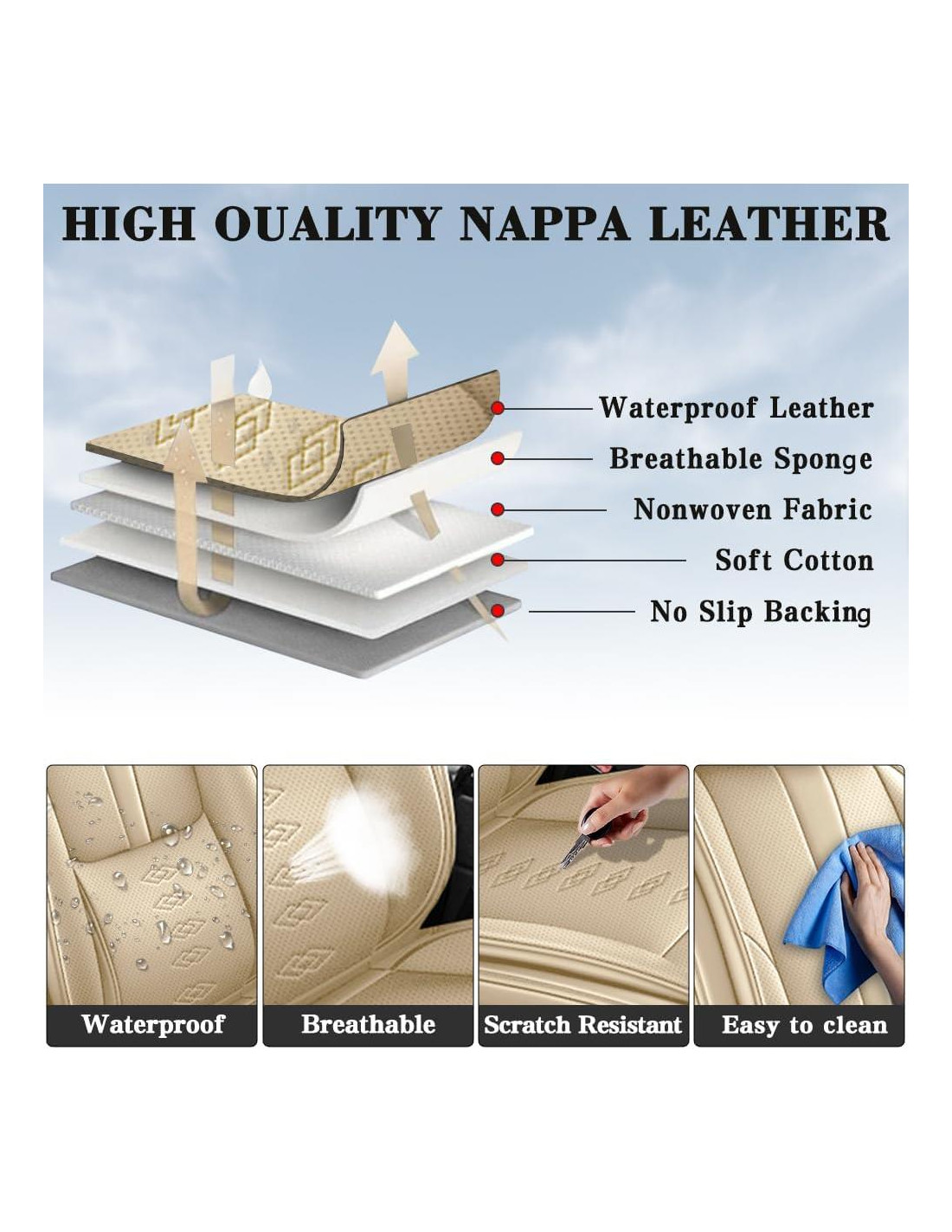 - [COMODIDAD Y MATERIALES DURADEROS] Esta cubierta de asiento de auto está hecha de cuero sintético de alta calidad y utiliza múltiples capas de tela. La esponja gruesa en la capa interna hace que las cubiertas de asiento sean muy suaves e impermeables, con una fuerte fuerza de compresión y fácil limpieza. La parte inferior y los lados traseros de los cojines de asiento del auto están diseñados con malla, que es transpirable y cómoda sin afectar las funciones de calefacción y refrigeración del asiento. Es muy adecuada para viajar en cada temporada.