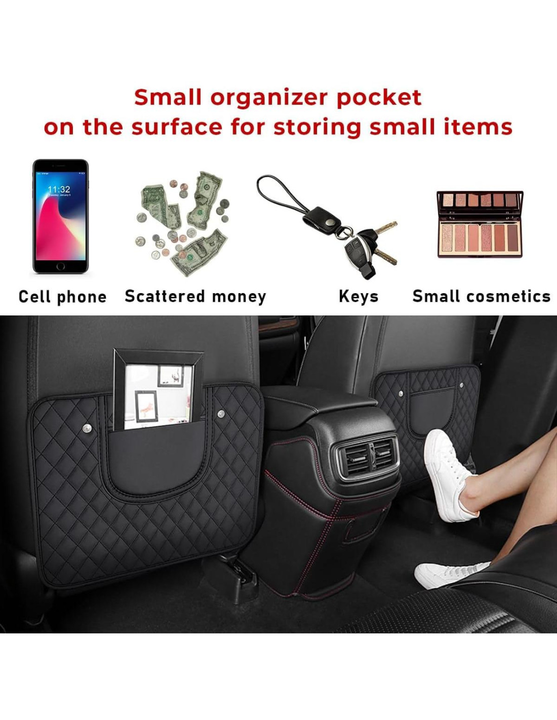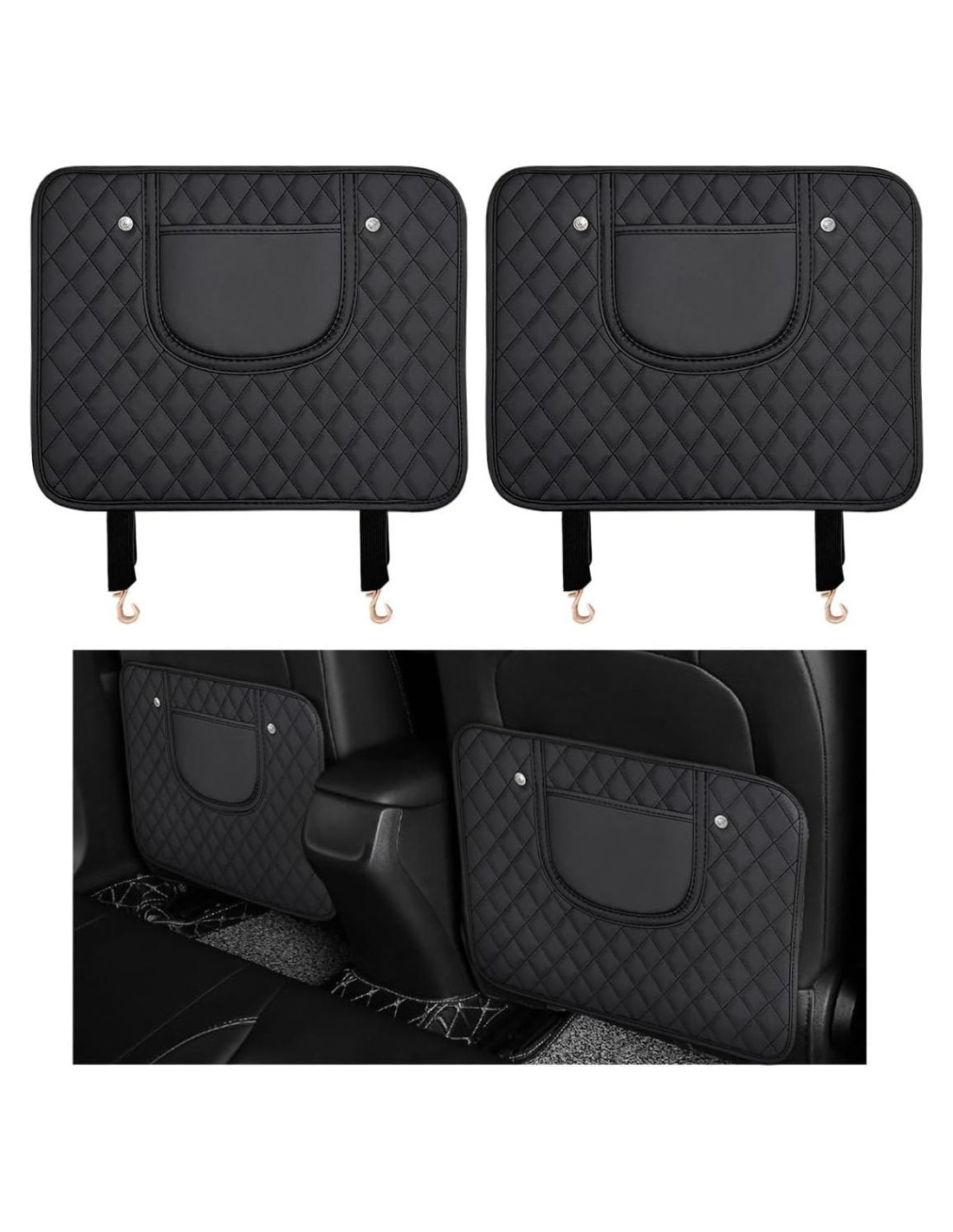 - [Almacenamiento Extra] : Los bolsillos de almacenamiento extra en los protectores de patadas pueden proporcionar espacio adicional para la organización de tu auto. Está disponible para que los pasajeros traseros guarden pequeños artículos como teléfonos celulares, llaves, etc., para ayudar a que el interior de tu auto esté más ordenado. Dado que hay dos protectores de patadas en el paquete, tienes dos bolsillos extra.