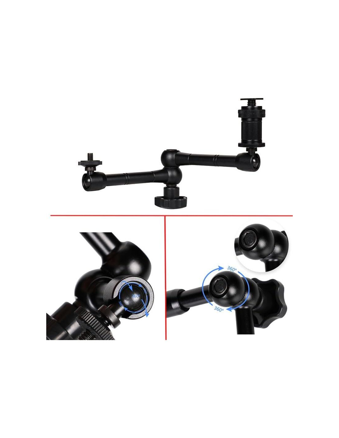 Parámetro del Producto Longitud (Máx): aproximadamente 28 cm (11 pulgadas) Carga Máxima: hasta 1500 g (3.3 lbs) Material: Acero Inoxidable y Aleación de Aluminio Peso Neto: aproximadamente 260 g (9.17 onzas) Paquete Incluido -1 x Brazo Mágico Articulado de 28 cm (11")