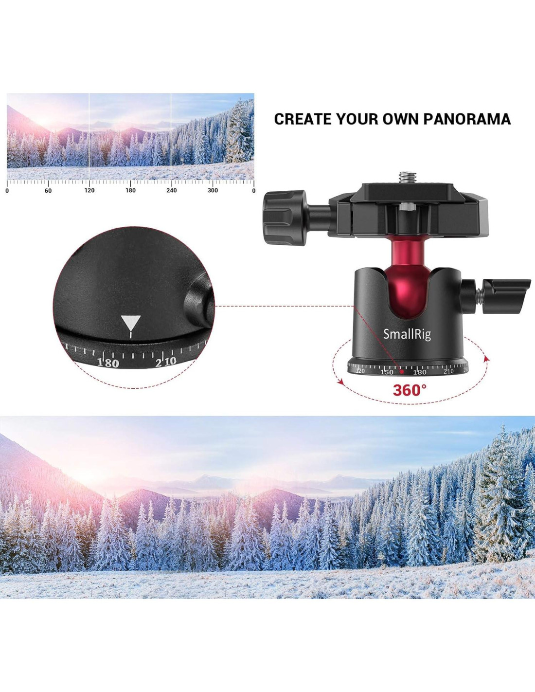 - Base de panorámica de precisión: la base del cabezal de bola SmallRig está finamente grabada con láser en incrementos de 5 desde -0 a 330 para seguimiento de panorámicas progresivas, ideal para fotografía panorámica de múltiples tomas.