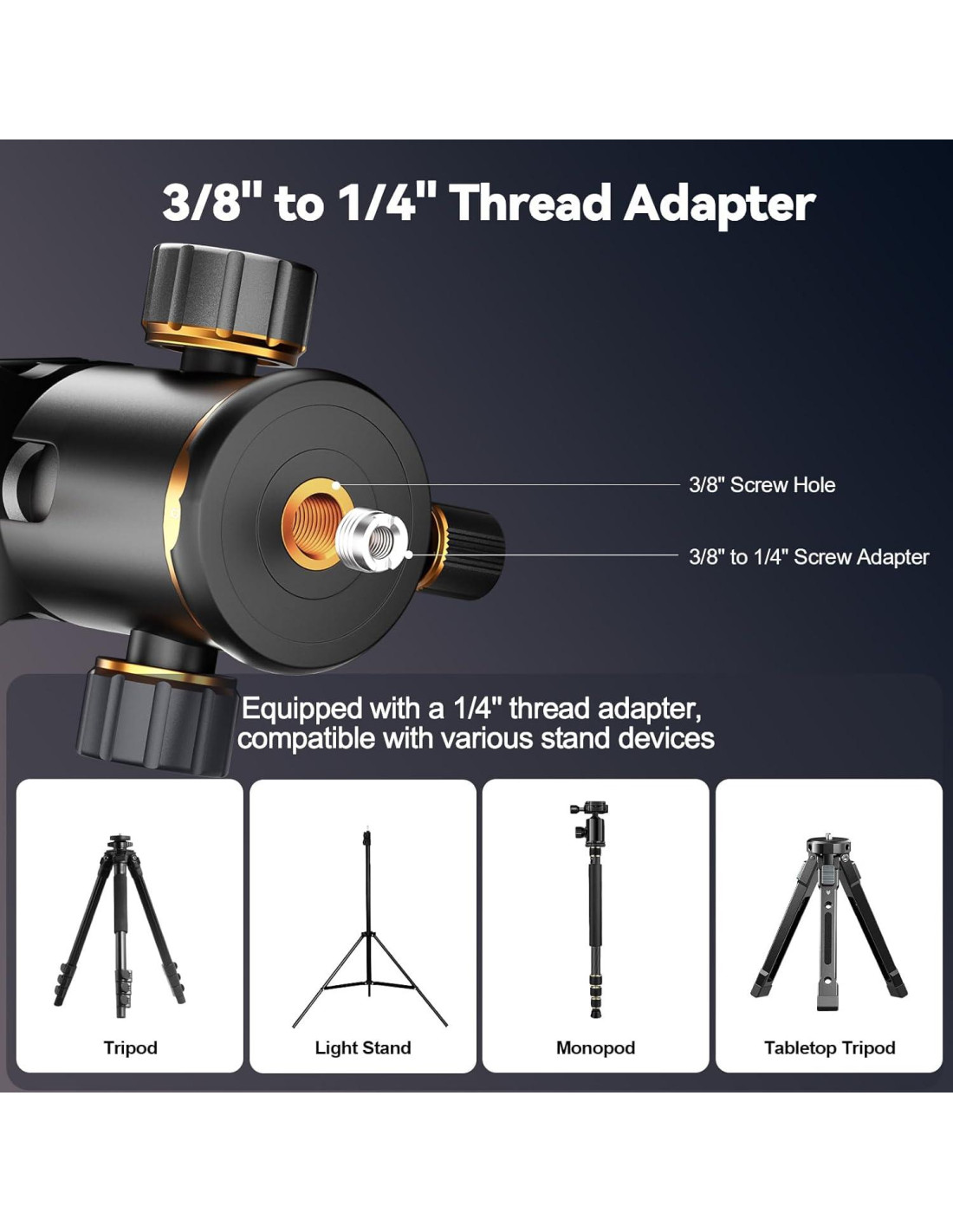 - [Amplia Compatibilidad] Este cabezal de bola está equipado con una placa de liberación rápida compatible con Arca de 1/4 de pulgada, compatible con las principales marcas de DSLR digitales (Sony, Canon, Nikon). La base roscada de 3/8 de pulgada cuenta con un adaptador de tornillo de 1/4"-3/8" para un montaje versátil en trípodes, soportes de luz y monopods.