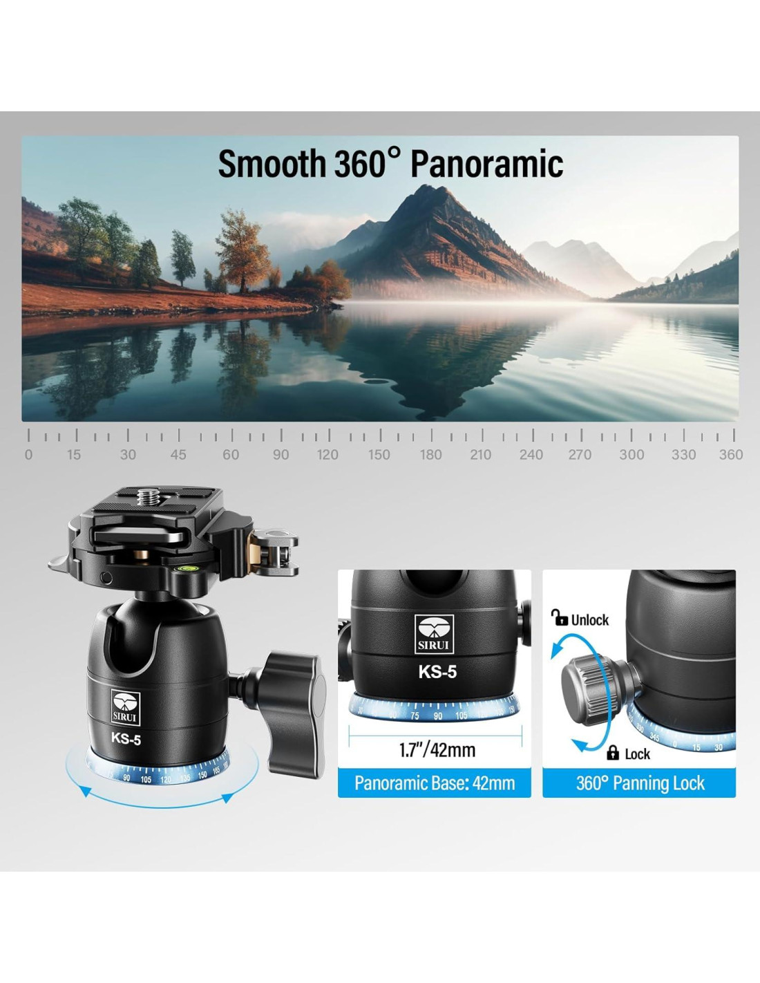 - Base de Panning de 360 Cabezal de trípode proporciona una operación suave para Panning de 360. Con marcas de índice grabadas, te ayuda a saber dónde estás cada vez que deseas hacer un panorama manual con tu cámara. El diseño de muesca en forma de U del cabezal de bola de perfil bajo puede cambiar fácilmente de disparo horizontal a disparo vertical.