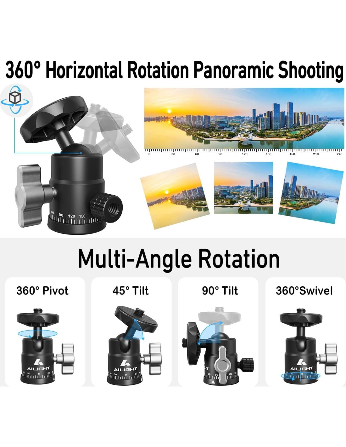 Con adaptador de zapata fría y adaptador de tornillo de 1/4" a 3/8", el cabezal de bola de trípode Ailight es un accesorio perfecto para cámaras DSLR, nos permite montar la cámara firmemente en muchos trípodes diferentes / palos de selfie / montura de bicicleta / soporte de micrófono o trípode ligero, incluso soporte de proyector de carga ligera, también se puede montar con luces / flashes / dispositivos de carga ligera a través de la montura de zapata fría. El cabezal de la cámara se puede rotar con un giro horizontal de 0~360 y una rotación de inclinación de 135 para fotografía panorámica y disparo vertical. La base del cabezal de metal tiene marcas de índice para indicar un control de ángulo más preciso. Este cabezal de trípode para cámara puede ser muy útil para fotografía macro, ángulos ajustados, vlogging y transmisión en vivo, podcasting y audio, grabación de vlogging y transmisión en vivo, podcasting y grabación de audio.