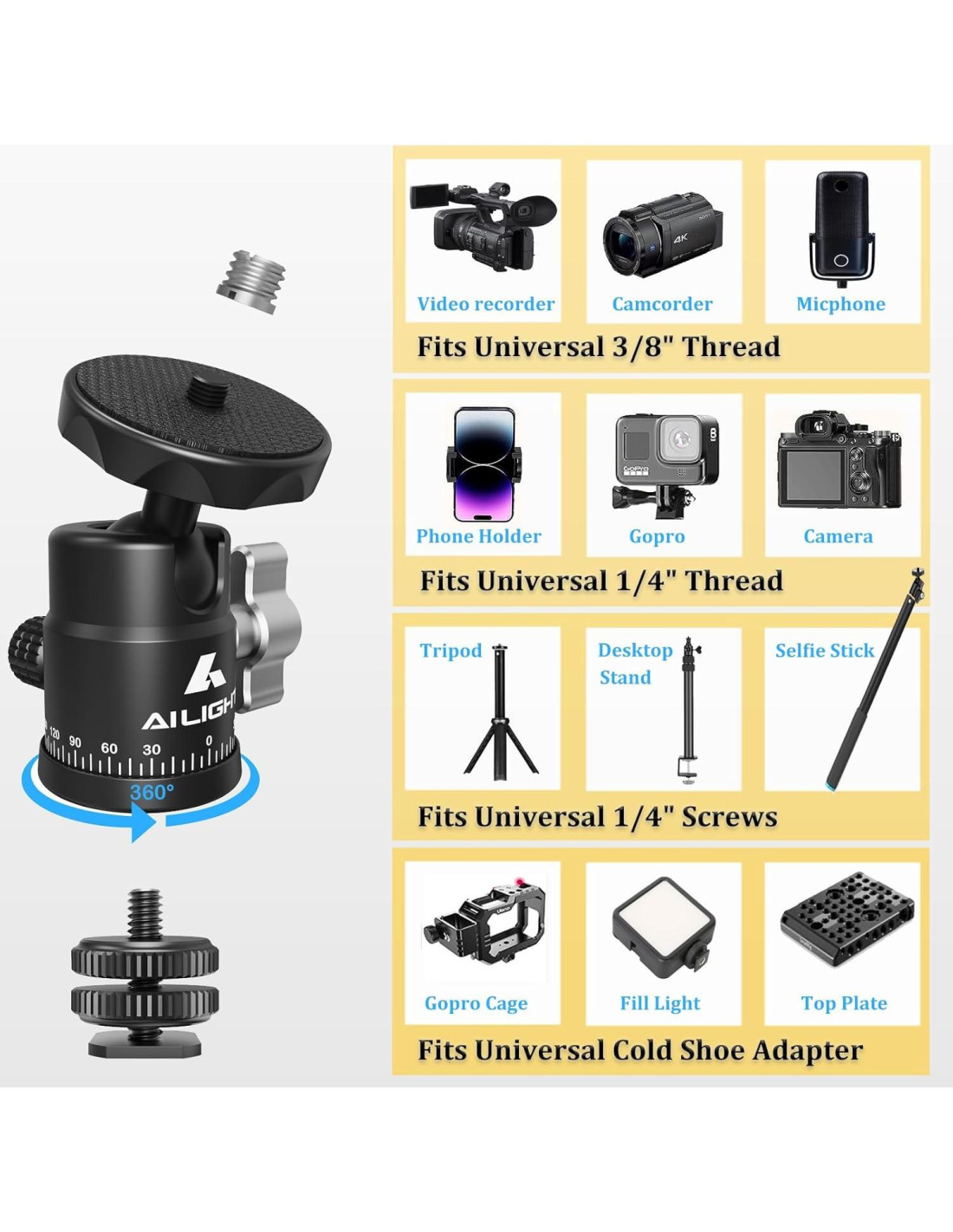 - Nuestro servicio: Ailight ofrece un servicio de calidad de 12 meses. Si tiene alguna pregunta, háganoslo saber. Paquete incluido: 2 x cabezal de bola de trípode mini; 2 x adaptador de tornillo de 1/4" a 3/8"; 2 x adaptador de zapata caliente