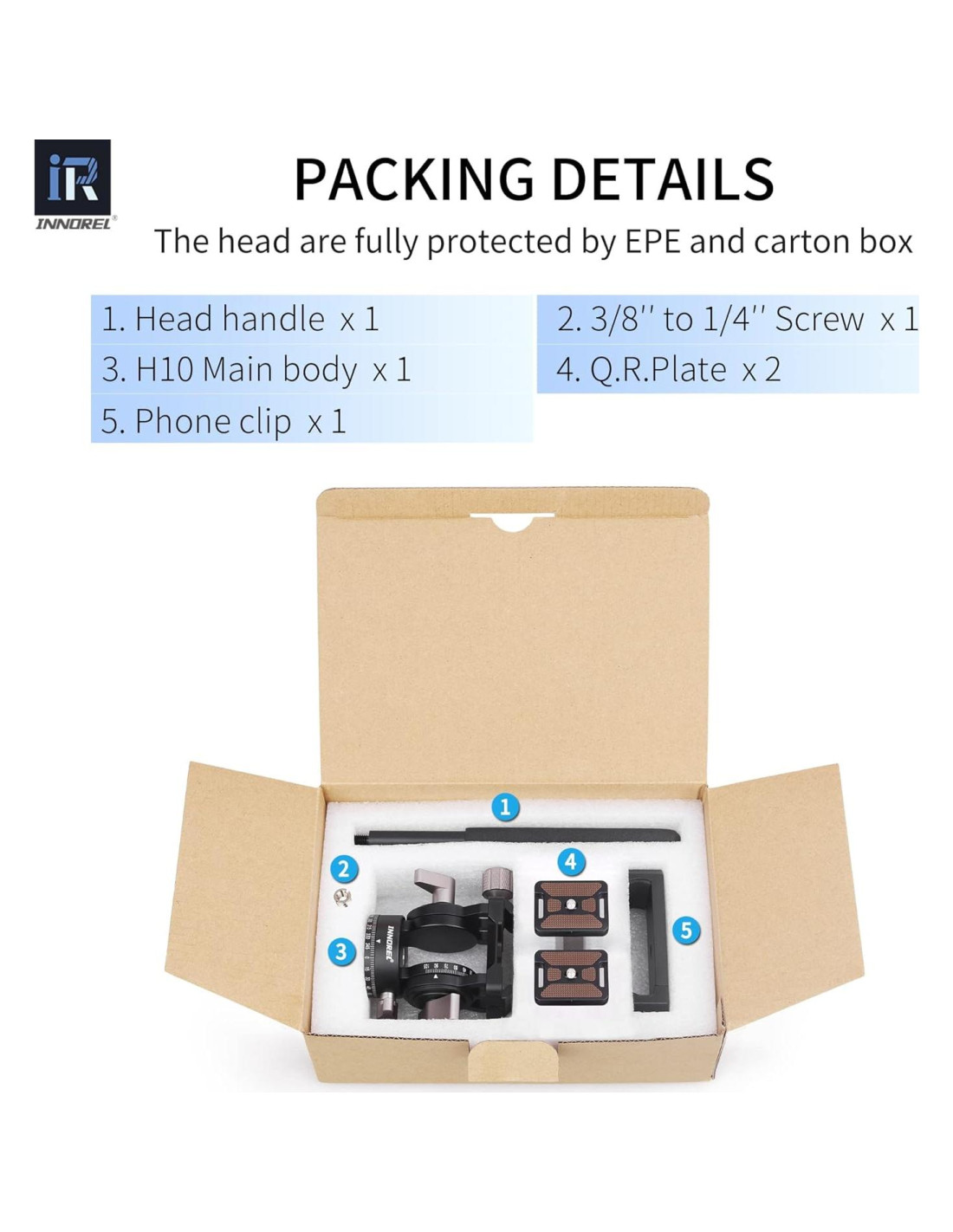 Especificaciones Marca: INNOREL Modelo: H10 Material: aleación de aluminio Peso neto: 0.55lb (0.25kg) Carga máxima: 8.8lb (4kg) Tornillo de montaje: 1/4" Agujero de tornillo inferior: 3/8" Diámetro inferior: 1.6" (40mm) Longitud del mango: 6.5" (165mm)