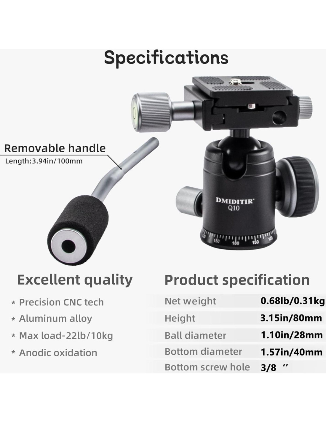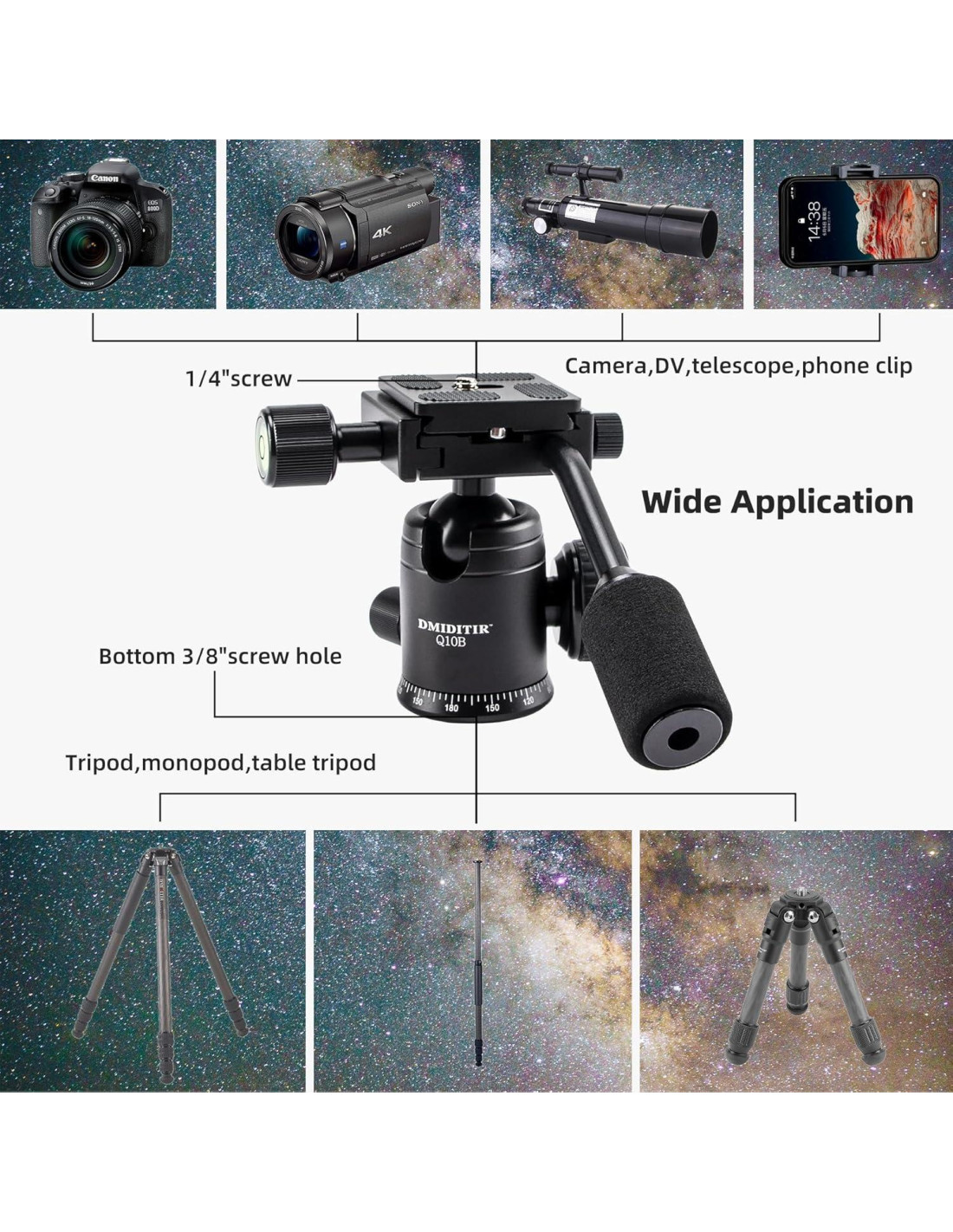 - Múltiples usos: El cabezal esférico panorámico es adecuado para varios dispositivos, como trípodes, monopie, cámaras DSLR, videocámaras, cámaras DV, telescopios y cámaras de caza. Se puede utilizar en fotografía interior o exterior, grabación de video y más.