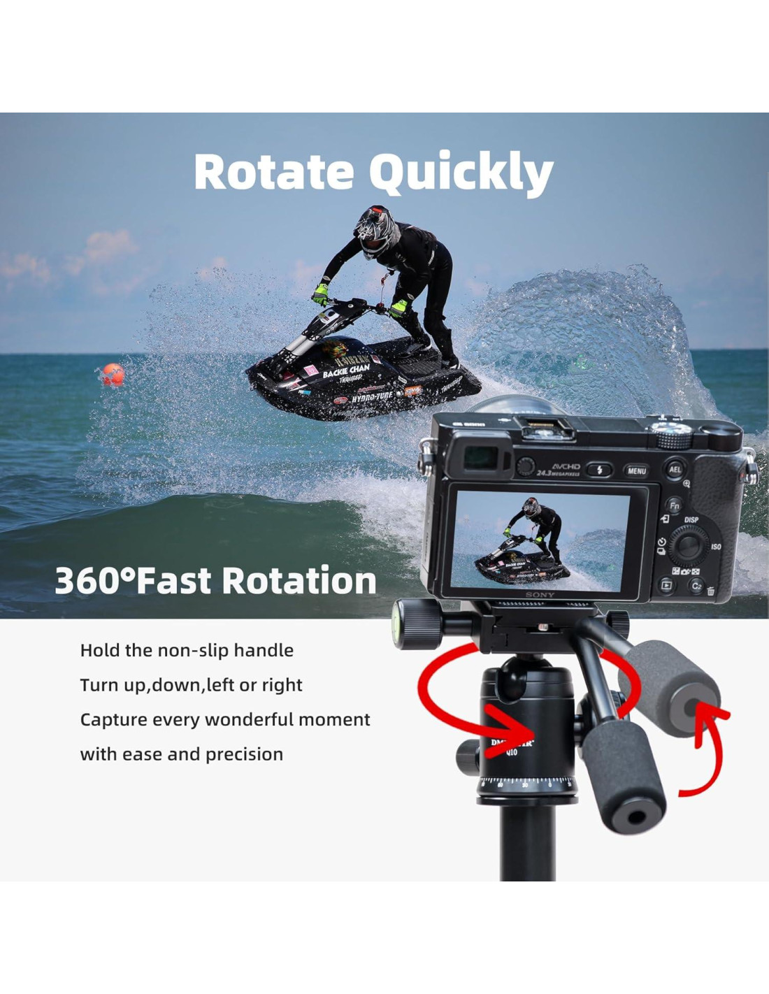 - Cabezal Esférico Panorámico con rotación de 360: El cabezal esférico puede rotar 360 horizontal o verticalmente, lo que te permite ajustar fácilmente el ángulo de tu cámara o smartphone. Esto es especialmente útil para tomar fotos panorámicas, fotos de grupo y fotos de paisajes.