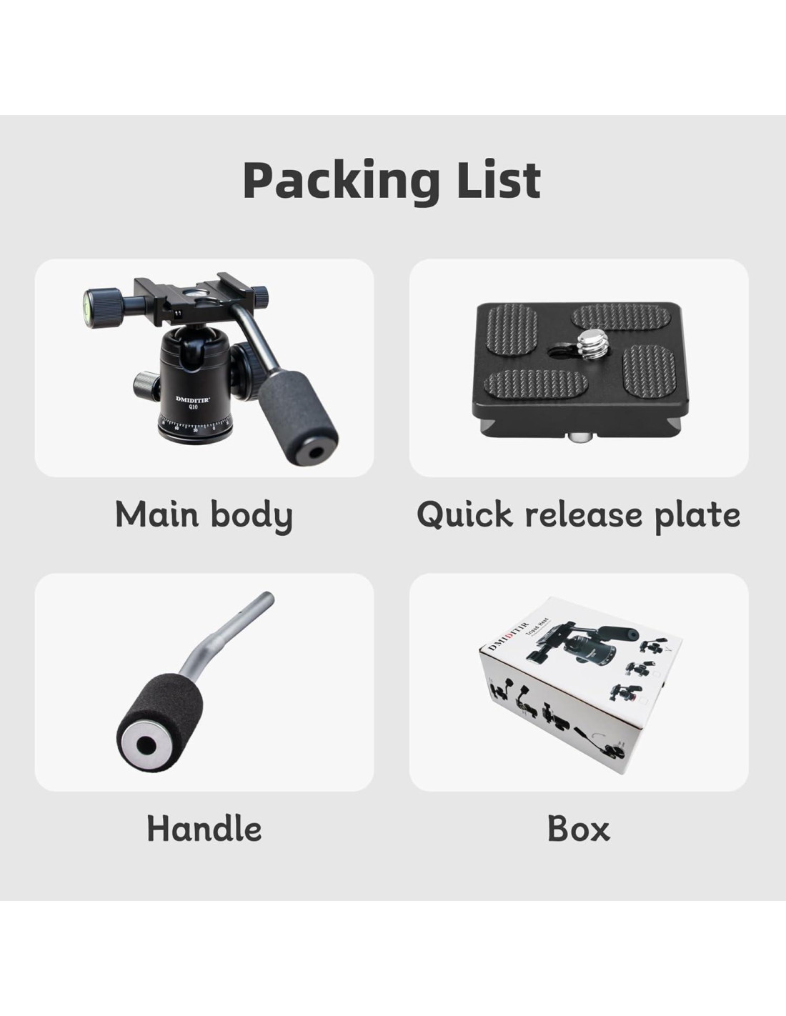 - Fácil de instalar: El cabezal esférico panorámico tiene un orificio de tornillo estándar de 1/4'' (6.35 mm), lo que facilita su instalación en la mayoría de los trípodes. También viene con una llave de montaje, lo que lo hace más conveniente de usar.