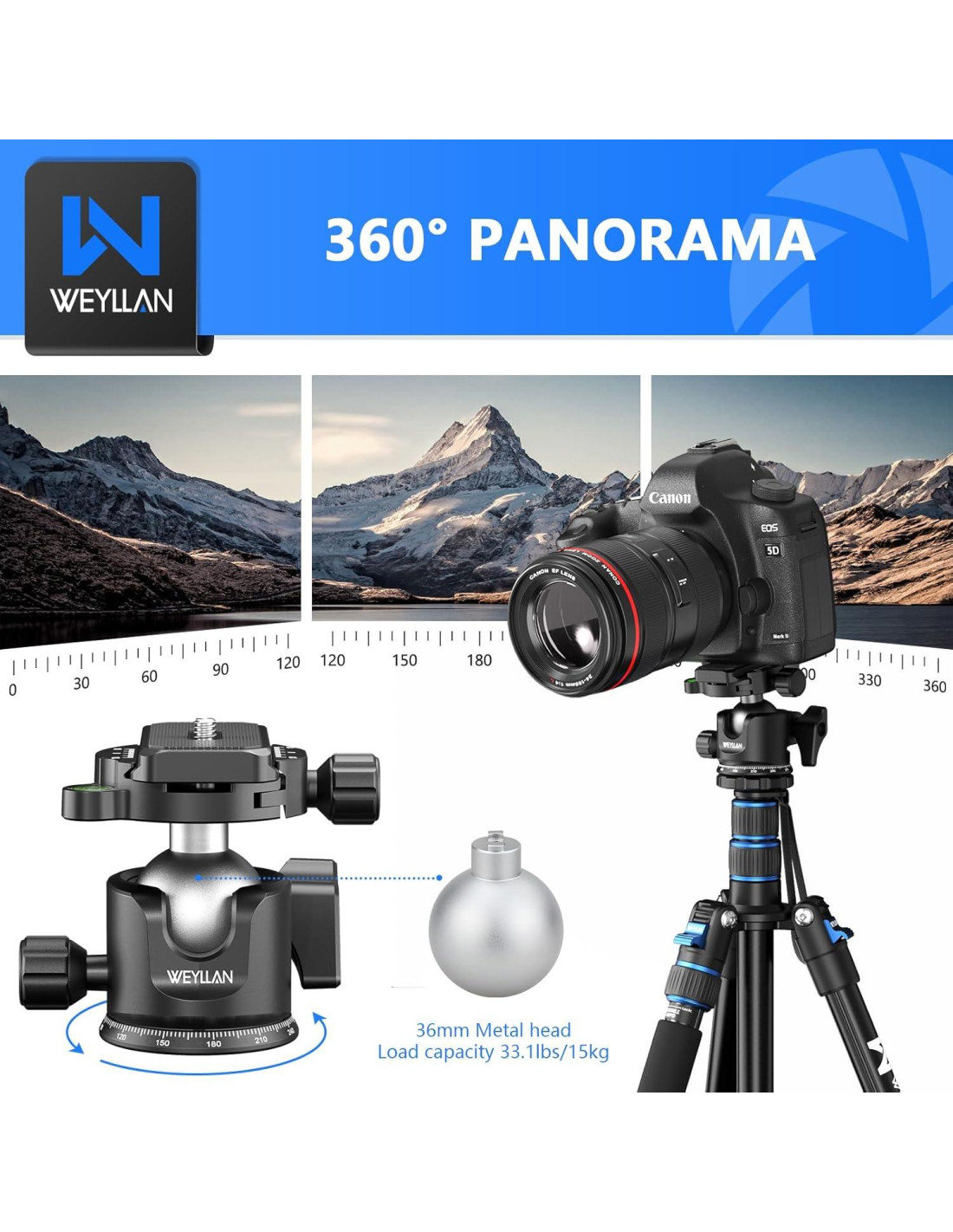 - Cabezal de cámara de trípode panorámico: Rote el cabezal de bola de trípode de 36 mm 360 o inclínelo 90 en la ranura en U para posicionar rápidamente la cámara. La rotación horizontal de 360 es conveniente para que los fotógrafos tomen fotos panorámicas.