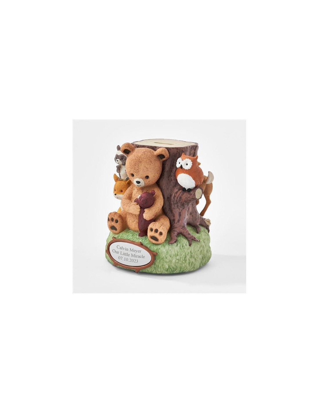Dale a tu pequeño favorito un lugar para guardar dinero en el Banco Personalizado de Animales del Bosque. Este adorable banco presenta una escena amistosa del bosque con un oso, un búho, un zorro, un mapache y un árbol. La parte superior del árbol cuenta con una ranura para monedas y está terminado con una placa frontal para grabar un nombre, fecha o mensaje corto. Tamaño: 14 cm H x 11.4 cm W x 12.9 cm D Material: Poliresina