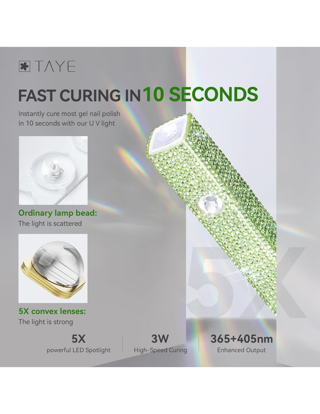 - [ Luz UV innovadora y de vanguardia ] La luz UV para uñas TAYE cuenta con un diseño llamativo con diamantes, equipada con perlas de lámpara de alta calidad que emiten 365 + 405nm, con lente convexa para lograr un foco amplificado 5 veces, reduce significativamente el tiempo de curado y asegura un curado uniforme desde múltiples ángulos, fácil de pegar encantos de uñas, gemas de uñas, pegatinas de uñas UV, esmalte de uñas en gel, resolviendo eficientemente la dificultad de curar geles de uñas.