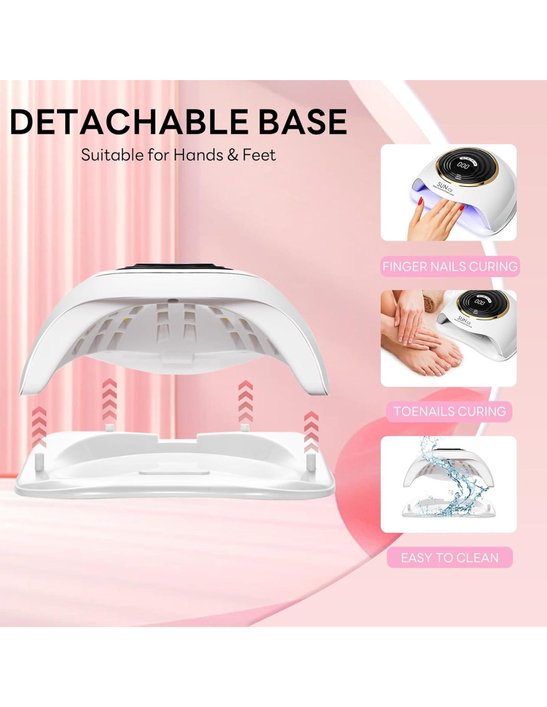 - [Amplia Compatibilidad] Esta lámpara de curado UV LED para uñas de gel tiene un gran compartimento para manos y una excelente distribución de perlas de luz para un curado impecable, uniforme y rápido de las cinco uñas a la vez. Curado rápido con todas tus marcas de gel de uñas favoritas, desde principiantes hasta grados profesionales. Puedes usarla para geles UV LED, geles duros, geles de construcción, geles de escultura, geles acrílicos y más. Por favor, confirma el tiempo de curado exacto de cada uno de los esmaltes de uñas, bases, capas superiores y geles para obtener mejores resultados.