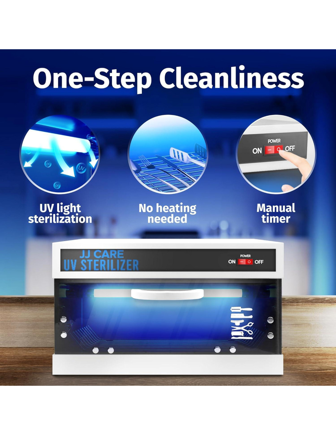 - Poder de Desinfección Excepcional - El desinfectante JJ CARE utiliza tecnología UV avanzada para limpiar a fondo tus herramientas, desinfectando tus herramientas en solo 30 minutos. Disfruta de una solución rápida y libre de químicos para una limpieza y tranquilidad máximas.