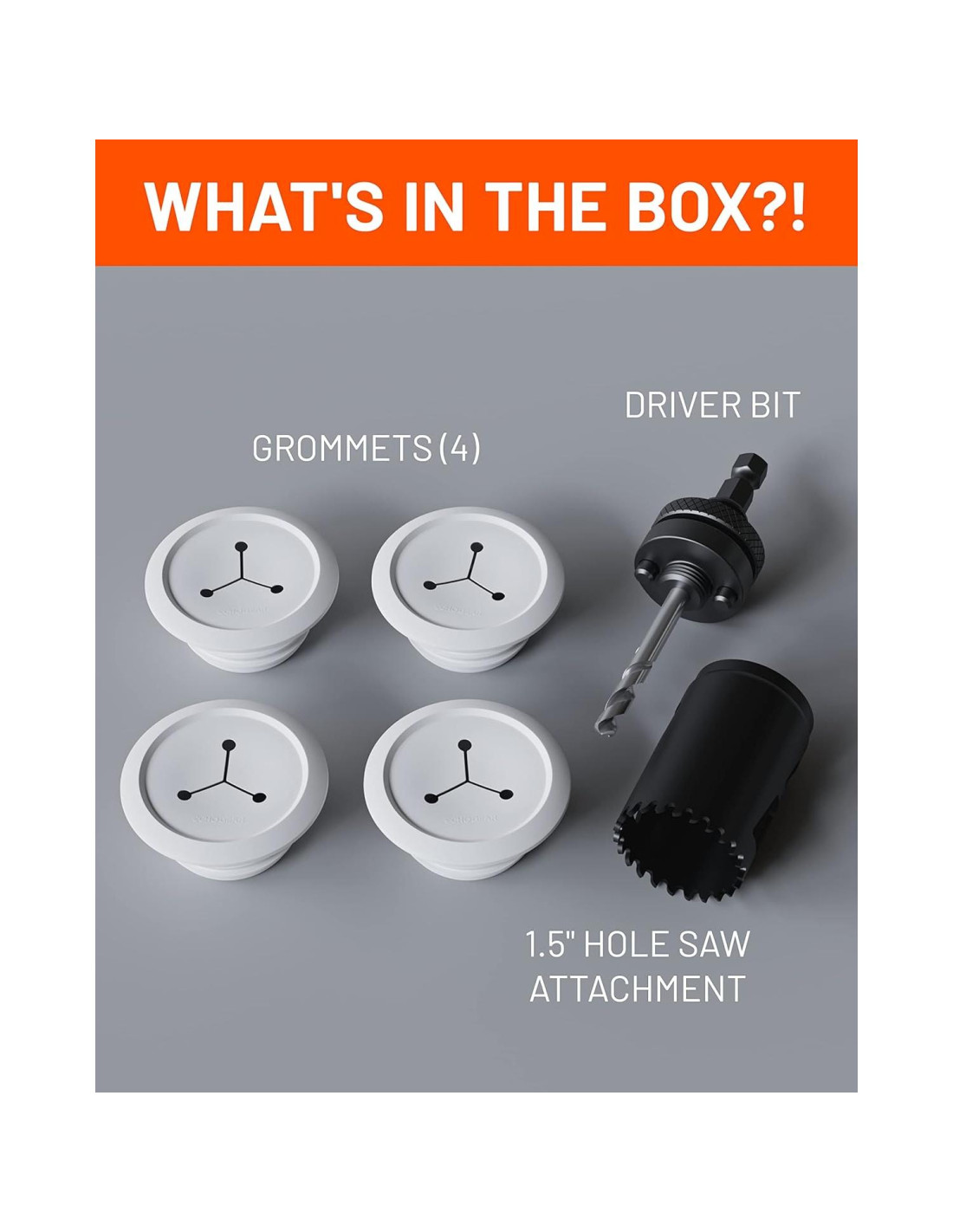 - El kit de gestión de cables todo incluido incluye 4 grommets de pared, un accesorio de taladro de sierra de agujero de 1.5". Ponte tus pantalones de bricolaje, agarra una bebida fría y ¡hagámoslo!