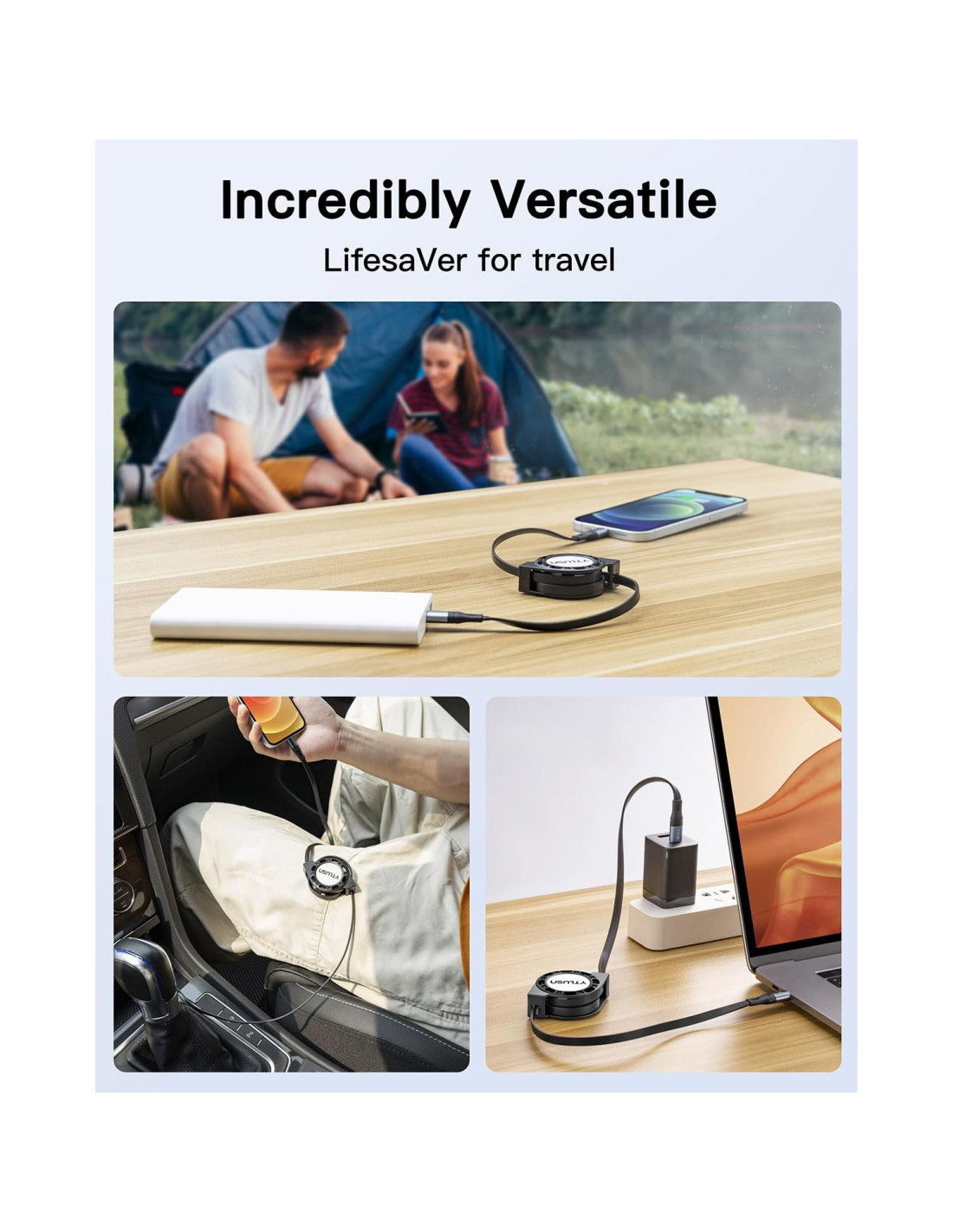 - [Cable USB C a USB C Universal] : Este cable USB C PD 100W retráctil tiene compatibilidad versátil para cargar todos tus dispositivos USB C; es tu cable de cargador de teléfono retráctil compacto cuando viajas. (Nota: Este cable Tipo-C es solo para transmisión de datos y no soporta transmisión de video).