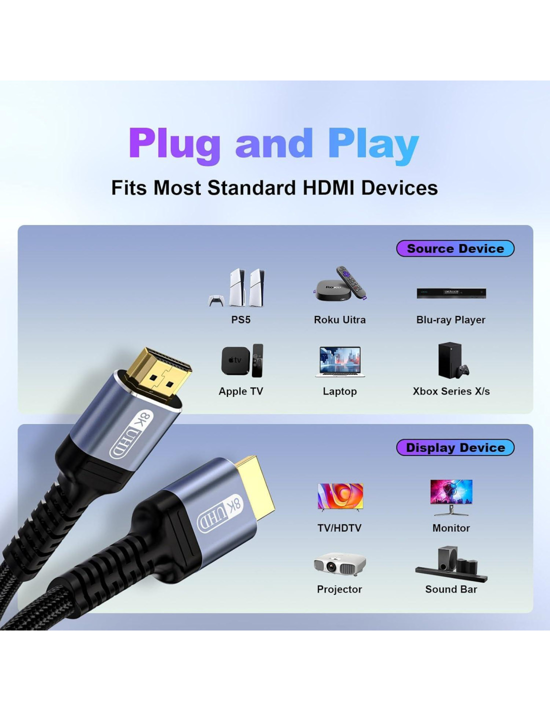 - [Sueño de Gamer] Con VRR, ALLM y 4K@120Hz, este cable HDMI 2.1 elimina el retraso y el desgarro de pantalla para PS4, PS5 y Xbox Series X. Logre una imagen super suave y más detallada.