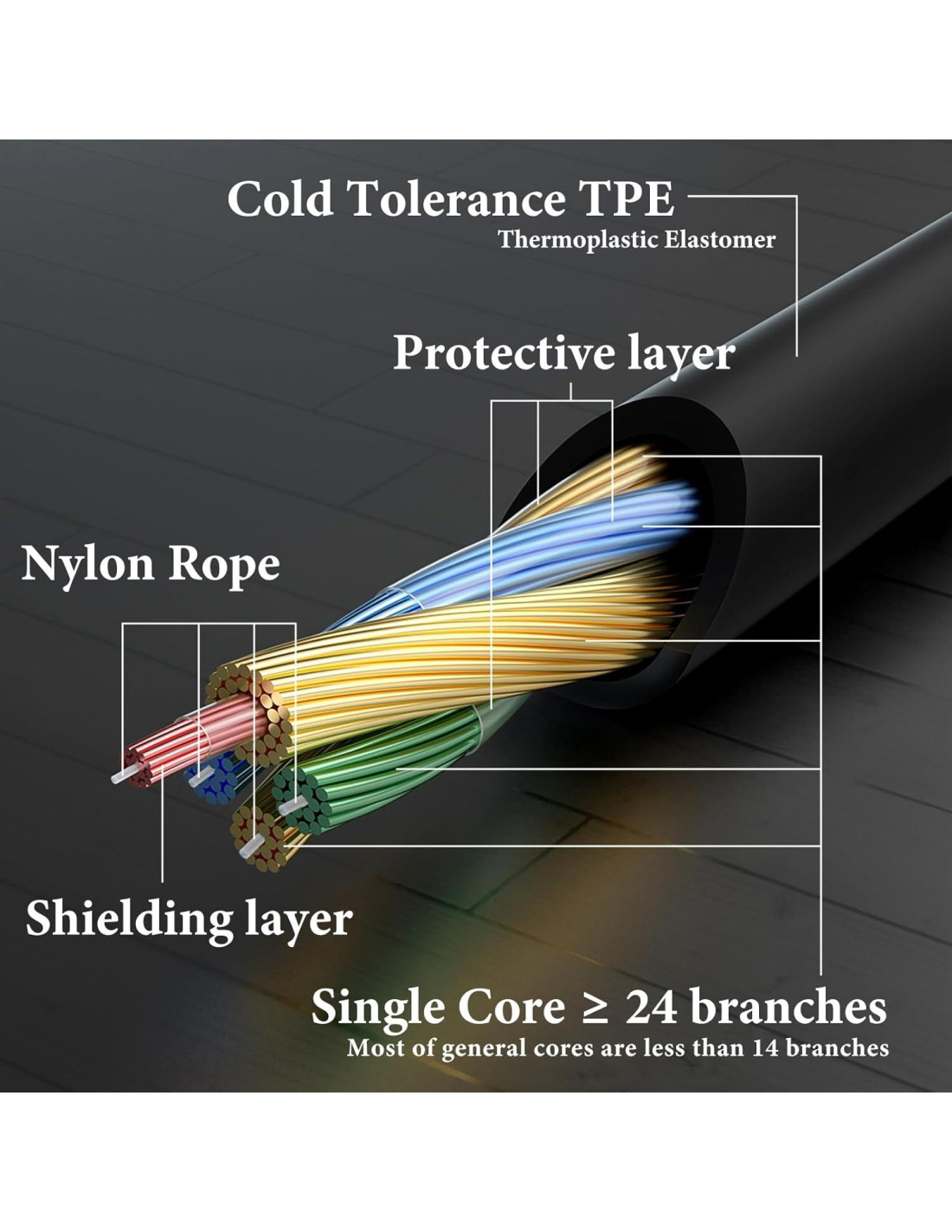 - Elastómero Termoplástico (TPE) asegura la transferencia de audio superior contra interferencias electromagnéticas o de radio (EMI o RFI), temperaturas extremas frías o calientes y máxima protección.