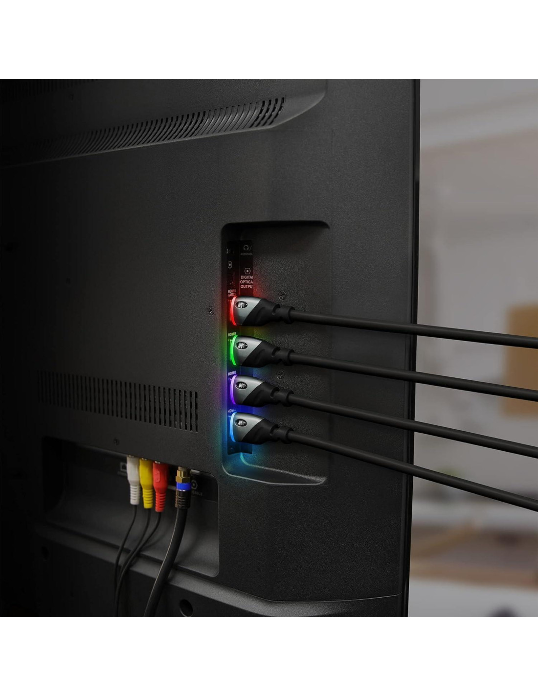 - Luz incorporada identifica dispositivos HDMI correspondientes: Localiza fácilmente tus dispositivos HDMI con una luz incorporada que ilumina un color particular. Cables iluminados en azul, púrpura, verde y rojo.