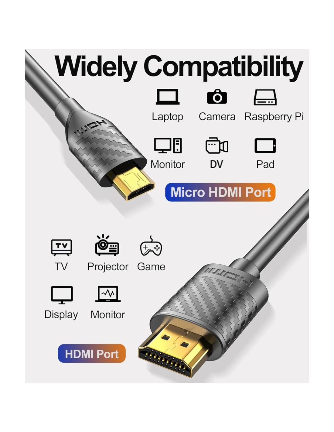Especificación: Conectores chapados en oro Micro HDMI a HDMI (Machos a Machos) Disponible en longitudes de 1.01m, 2.01m y 3.05m Color negro, 1 paquete Características clave: Rendimiento de alta velocidad - Soporta 4K@60Hz, HDR, 3D y transferencia de datos de alta velocidad para una experiencia de visualización sin interrupciones. Durabilidad mejorada - Presenta conectores chapados en oro, blindaje de triple capa, cableado de cobre estañado y puntos de tensión reforzados para una fiabilidad duradera. Conveniencia Plug & Play - No se necesitan controladores ni software, lo que facilita su uso directamente al sacarlo de la caja. Compatibilidad universal - Perfecto para transmitir desde tabletas, cámaras, Raspberry Pi 4, GoPro, Lenovo Yoga, tarjetas gráficas, HDTV, monitores y proyectores. Garantía de por vida - Diseñado para un uso sin complicaciones, asegurando durabilidad a largo plazo y rendimiento fiable. Nota importante: Asegúrese de que su dispositivo tenga un puerto Micro HDMI-no Mini HDMI o Micro USB! Consulte las imágenes y la descripción del producto para orientación. (Micro HDMI Mini HDMI Micro USB).