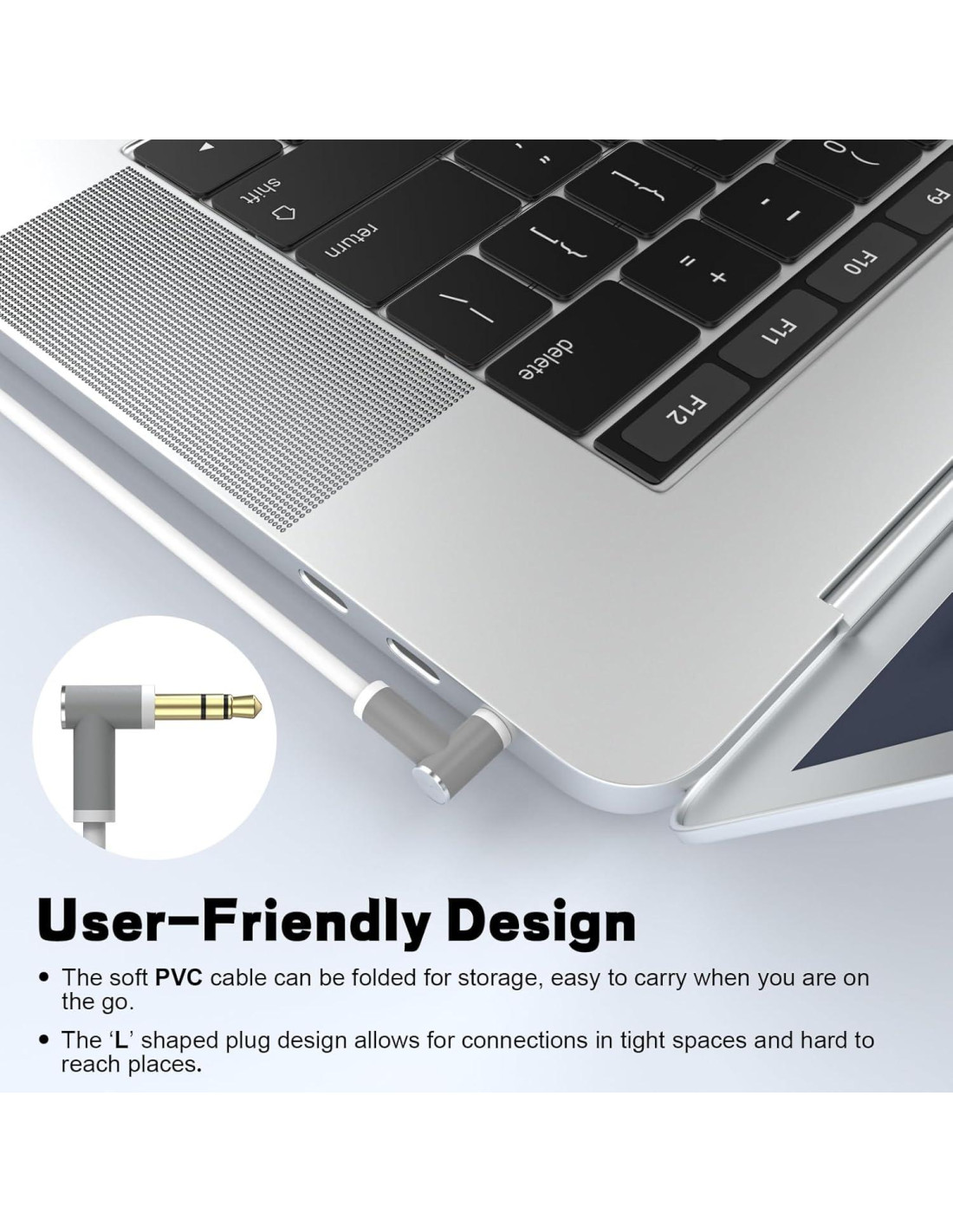 - Diseño amigable para el usuario: El cable auxiliar Solo 4 de PVC suave se puede doblar para almacenamiento, fácil de llevar cuando estás en movimiento. El diseño del conector en forma de 'L' permite conexiones en espacios reducidos y lugares de difícil acceso