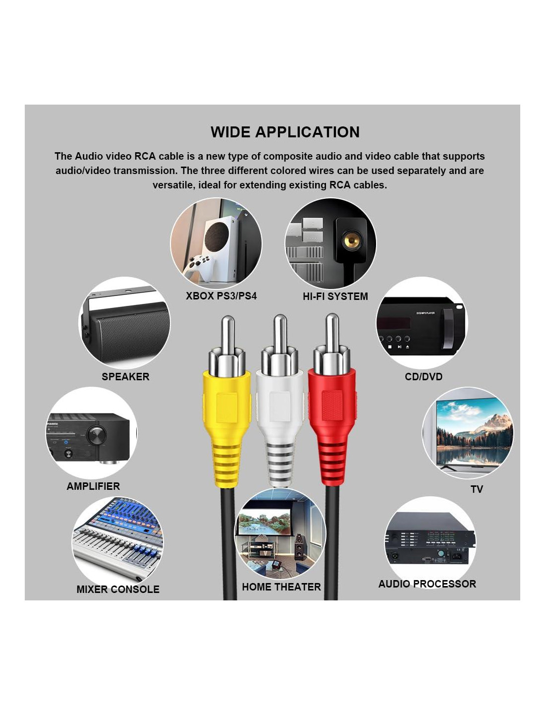 - - | APLICACIÓN AMPLIA | - El cable RCA de audio y video es un nuevo tipo de cable compuesto de audio y video que soporta transmisión de audio/video. Los tres cables de diferentes colores se pueden usar por separado y son versátiles, ideales para extender cables RCA existentes.