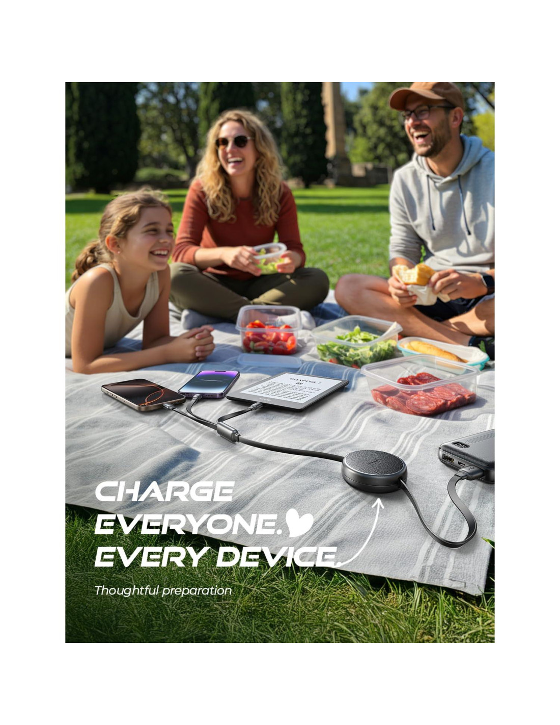 - [Esenciales de Viaje y Camping] El cable de carga 3 en 1, cable usb c retráctil resuelve perfectamente el desorden causado por cables excesivos en tu escritorio y en tu coche, manteniendo tu vida consistentemente ordenada y organizada. Cuando te estés preparando para viajar, ya no necesitas llevar un montón de cables diferentes para varios dispositivos. Con solo un cabezal de carga USB-A, puedes cargar tres dispositivos simultáneamente, mejorando enormemente la eficiencia. Es un compañero imprescindible para tus viajes.