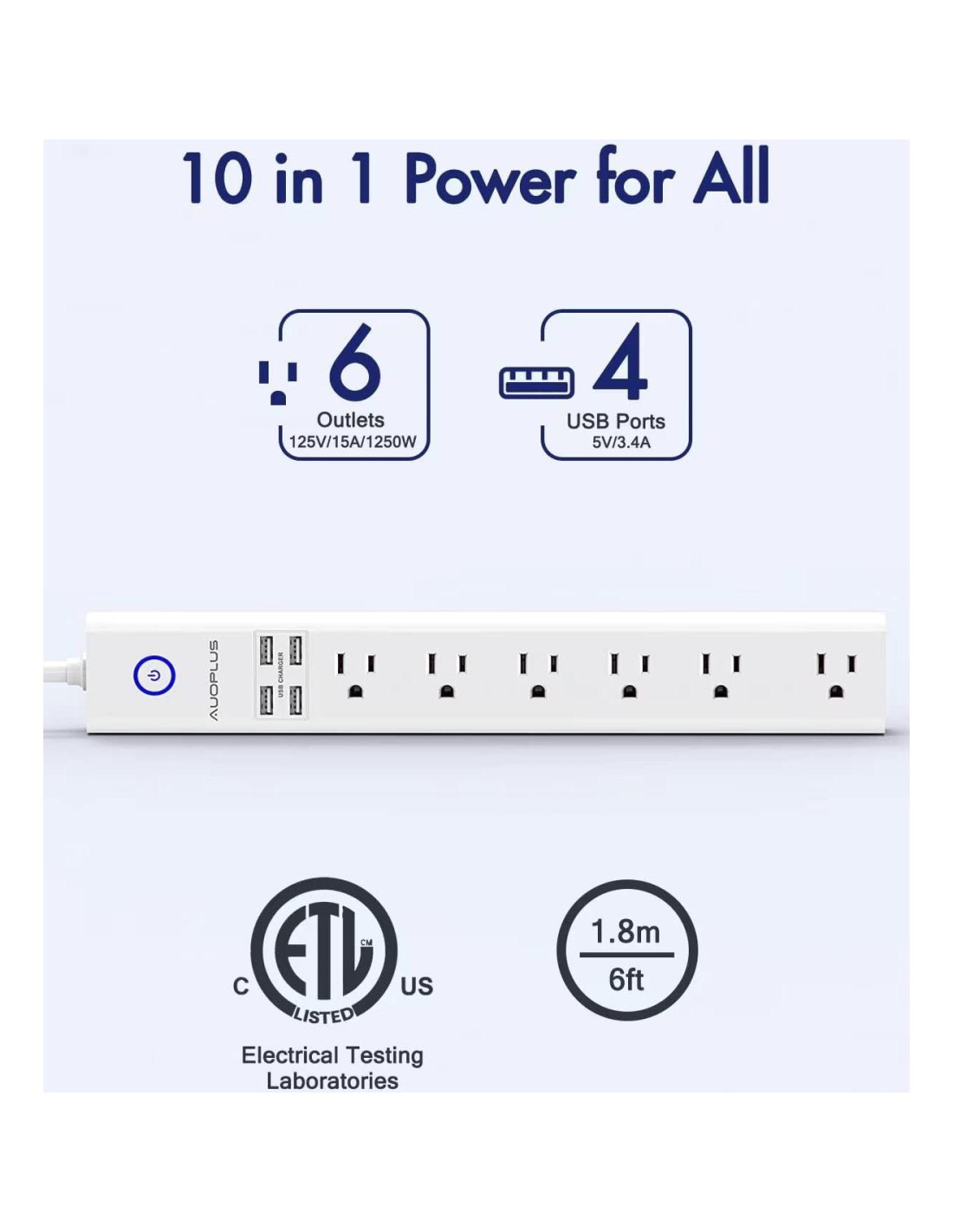 - Regleta 10 en 1: Con un cable de extensión de 1.83 m de alta resistencia, este protector de sobretensión con 6 salidas amplias (1250W/10A) y 4 puertos de carga USB (Total 5V/3.4A) puede alimentar hasta 10 dispositivos eléctricos simultáneamente. Es ideal para el hogar, la oficina y residencias estudiantiles.