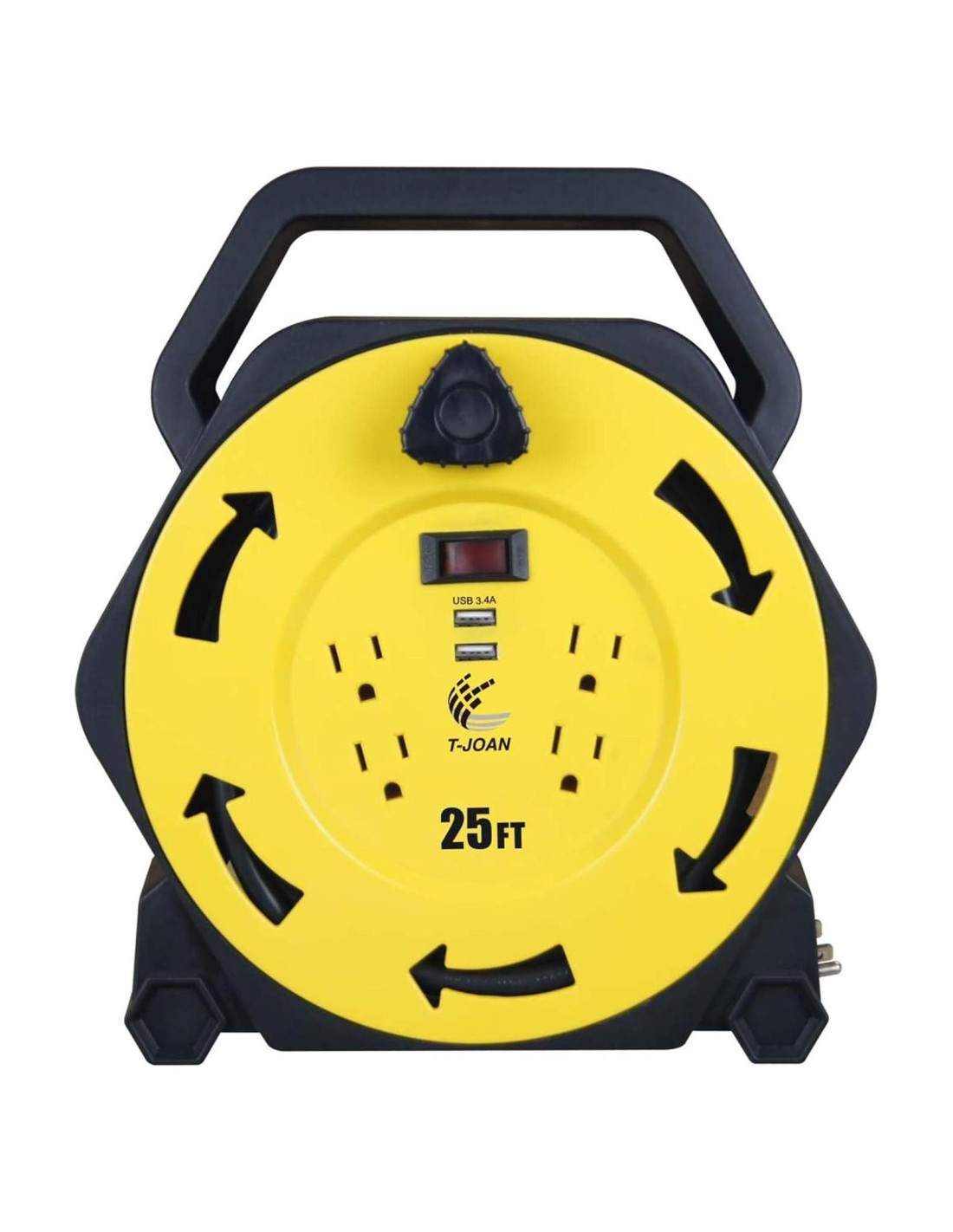 Carrete de Cable de Extensión con Cable de Poder de 25 PIES (7.62 METROS), Retráctil de Mano, 16/3 AWG SJTW, 4 Salidas a Tierra, Interruptor de Circuito de 13 Amperios. La cubierta de plástico hace que este carrete de cable retráctil sea resistente a la intemperie y al polvo, perfecto para usar en interiores/exteriores; Interruptor de circuito de 13A incorporado (interruptor manual iluminado ON/OFF) protege los dispositivos contra cortocircuitos y sobrecargas, que cortará automáticamente el suministro de energía cuando la corriente total de los dispositivos conectados supere los 13A; presione el interruptor rojo para continuar usando después de la desconexión. Incluye 2 puertos de carga USB (salida total de 3.4A) y 4 salidas a tierra, además de dispositivos de alta resistencia, el carrete de cable T-JOAN también puede cargar su otro equipo electrónico, como teléfonos, laptops, altavoces bluetooth; no más situaciones embarazosas. Calificado para 13 amperios, 125 voltios y 1625 vatios, la estación de energía del carrete de cable eléctrico de alta resistencia tiene 4 salidas integradas de 3 clavijas y le permite alimentar múltiples herramientas a la vez.