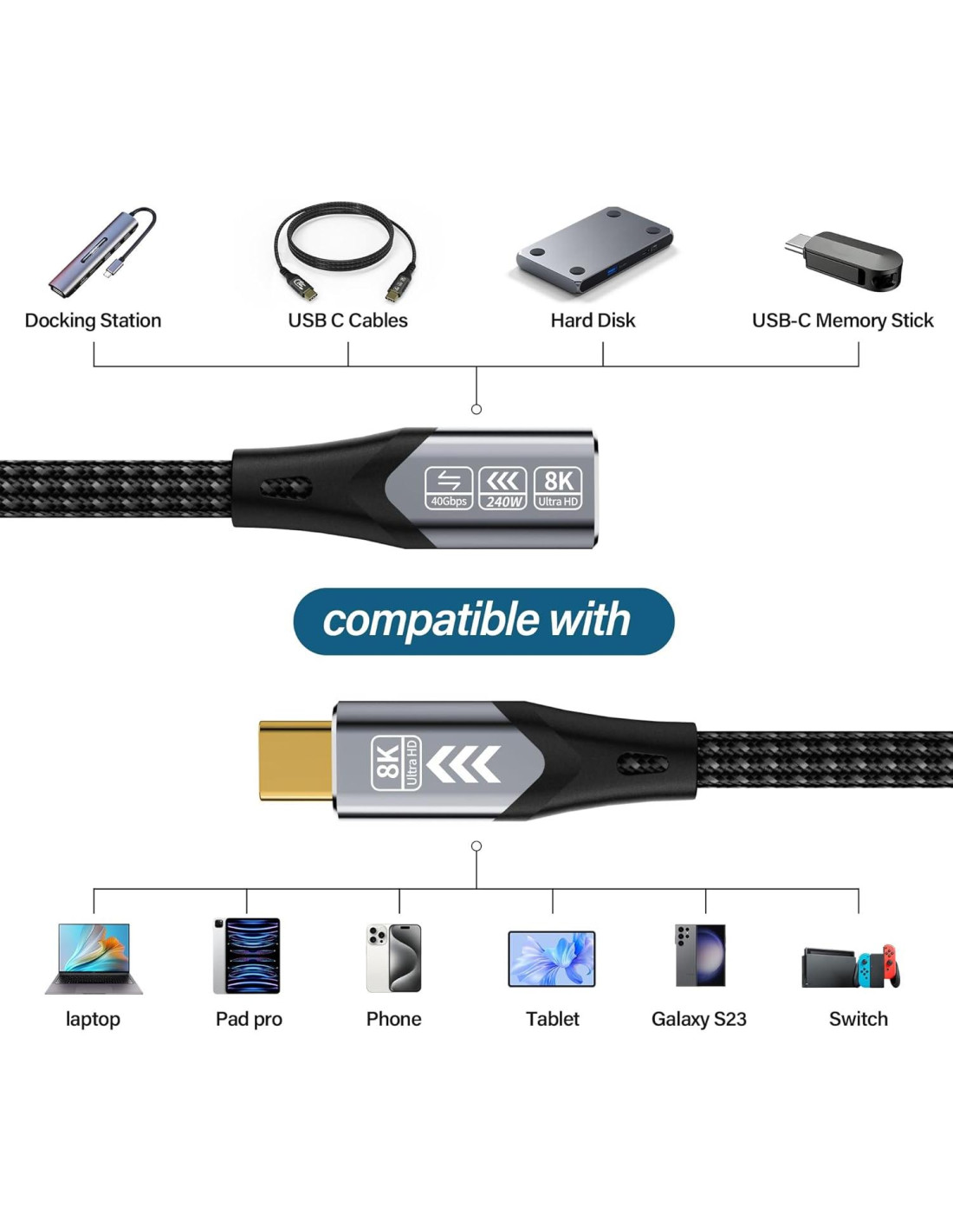 - Funciona con todo: Diseñado para compatibilidad universal, este cable USB-C macho a hembra funciona sin problemas con Thunderbolt 4, Thunderbolt 3 y dispositivos USB 3.2/3.1/3.0/2.0. Es perfecto para extender conexiones a laptops, smartphones, tabletas, monitores. También soporta SSD externos, estaciones de acoplamiento, eGPUs, auriculares VR y hubs tipo C, lo que lo convierte en una solución de extensión USB-C versátil.