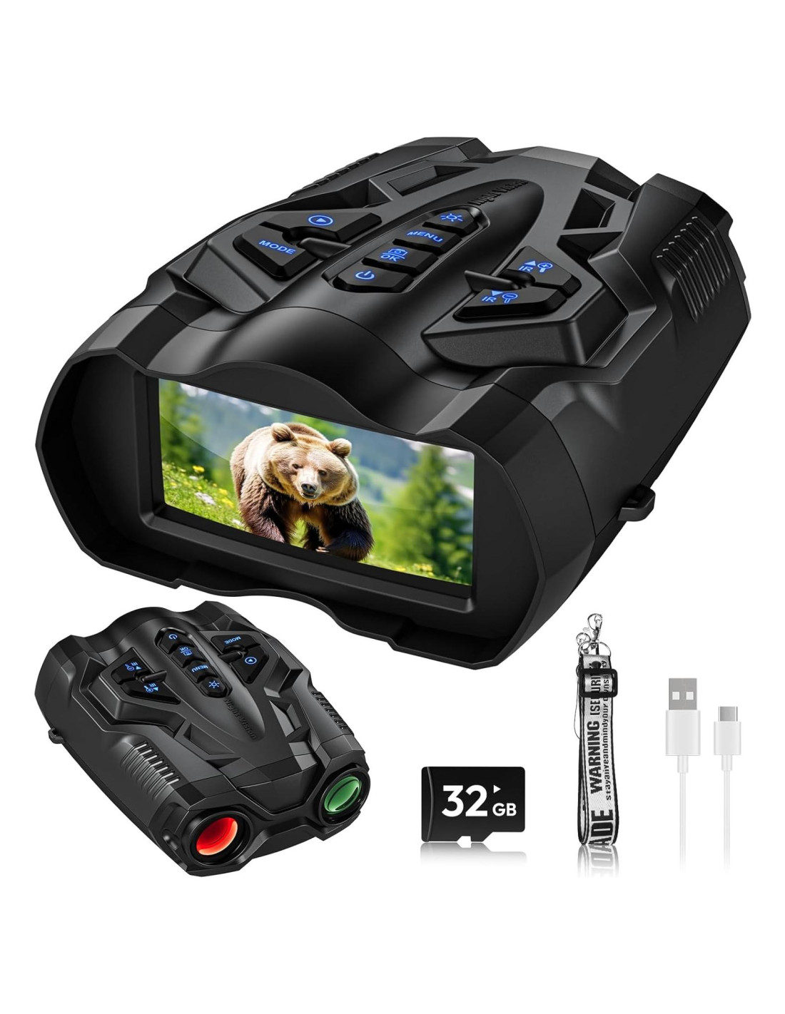 - Paquete Incluido: Este paquete incluye 1 x Gafas de Visión Nocturna, 1 x Tarjeta de Memoria de 32GB, 1 x Correa para el Cuello, 1 x Cable de Datos Tipo-C de 3.3 pies, 1 x Manual del Usuario, y 1 x Paño de Limpieza. Además, recibirás nuestra garantía de devolución de dinero de 30 días y garantía de 2 años. Estos Binoculares de Visión Nocturna son perfectos para adultos que disfrutan de actividades al aire libre como la pesca nocturna, camping y observación de vida silvestre en completa oscuridad.