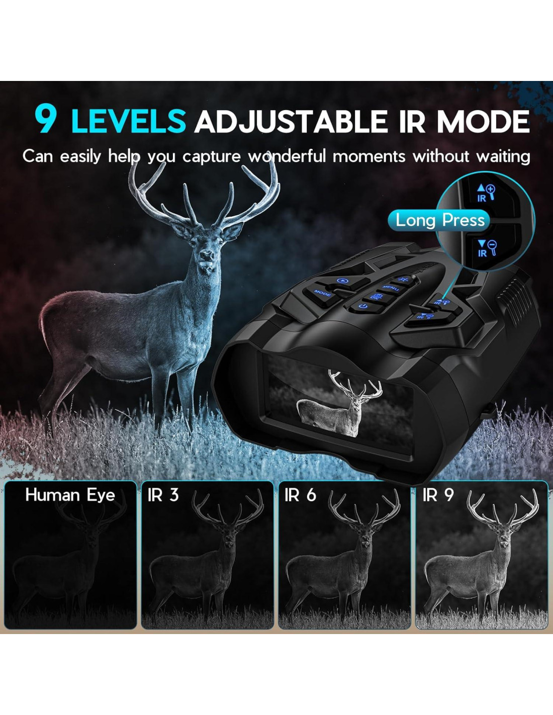 - Ver Claramente en la Oscuridad Total con Gafas de Visión Nocturna: Estas gafas de visión nocturna cuentan con un iluminador infrarrojo ajustable de 9 niveles (850 nm) que se puede ajustar según la situación real, lo que te permite ver fácilmente animales nocturnos en entornos completamente oscuros. Los binoculares de visión nocturna pueden grabar video en 4K UHD y capturar imágenes de 36MP, permitiendo una visualización clara en la noche y el guardado instantáneo de los medios capturados.