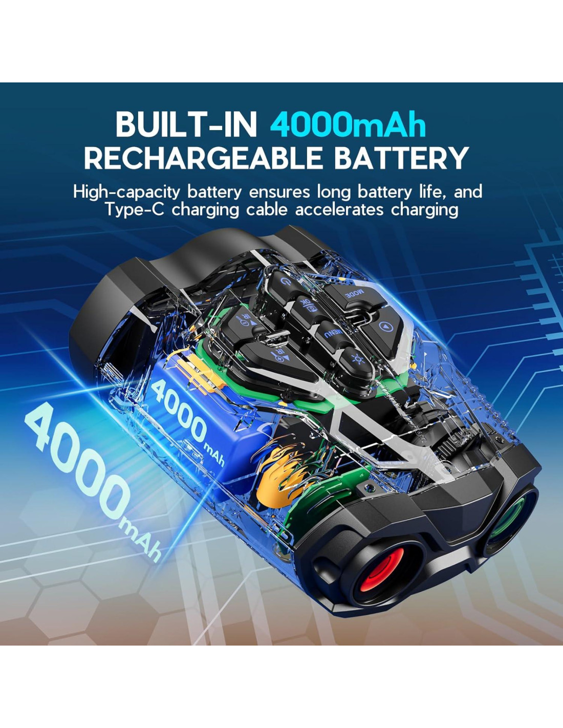 - Batería de Litio Recargable: Los binoculares digitales 4K son alimentados por una batería recargable de 4000mAh de Li-ion, lo que permite la observación continua de tu objetivo en la oscuridad total durante horas. Solo toma unas pocas horas cargar completamente la batería, y no es necesario usar baterías AAA. Esto hace que el dispositivo sea más duradero, seguro y más amigable con el medio ambiente que otros productos, además de ahorrarte dinero.