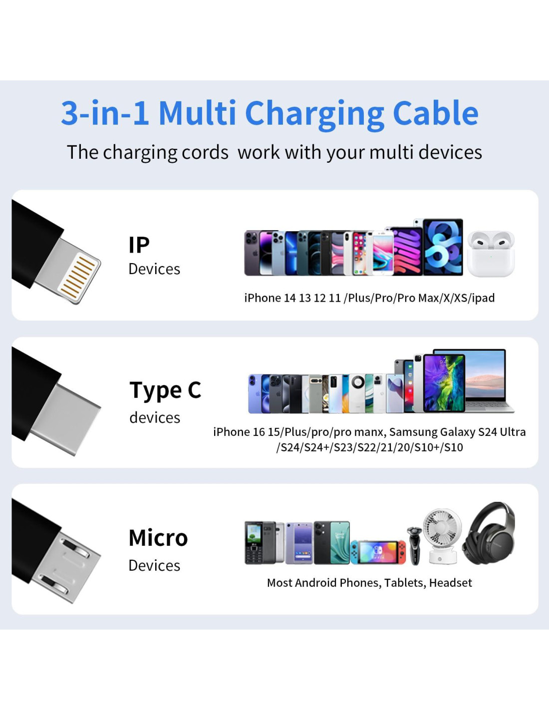 - Altamente Compatible: Solo un cable para todos tus dispositivos. - El Cable Tipo C: compatible con dispositivos que soportan tipo c, incluyendo la serie iPhone16/15. - El Cable Micro USB: la mayoría de los teléfonos Android y Windows, tabletas y muchos otros dispositivos. - El Cable de Carga Lightning se puede usar para iPhone/iPad/tabletas y más
