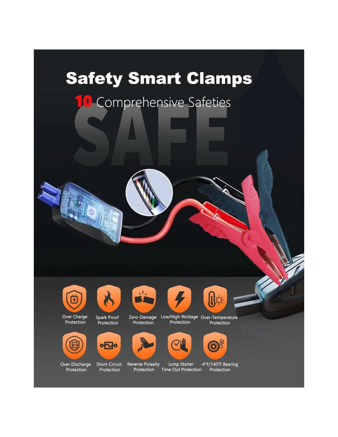 - Seguridad Integral: Nuestro arrancador de batería portátil para coche tiene 10 protecciones de seguridad inteligentes contra sobrecarga, cortocircuitos, polaridad inversa, picos de energía y chisporroteos, entre otros. La luz indicadora del cable del arrancador de coche notifica en tiempo real las operaciones incorrectas, protegiéndote a ti y a tu vehículo.