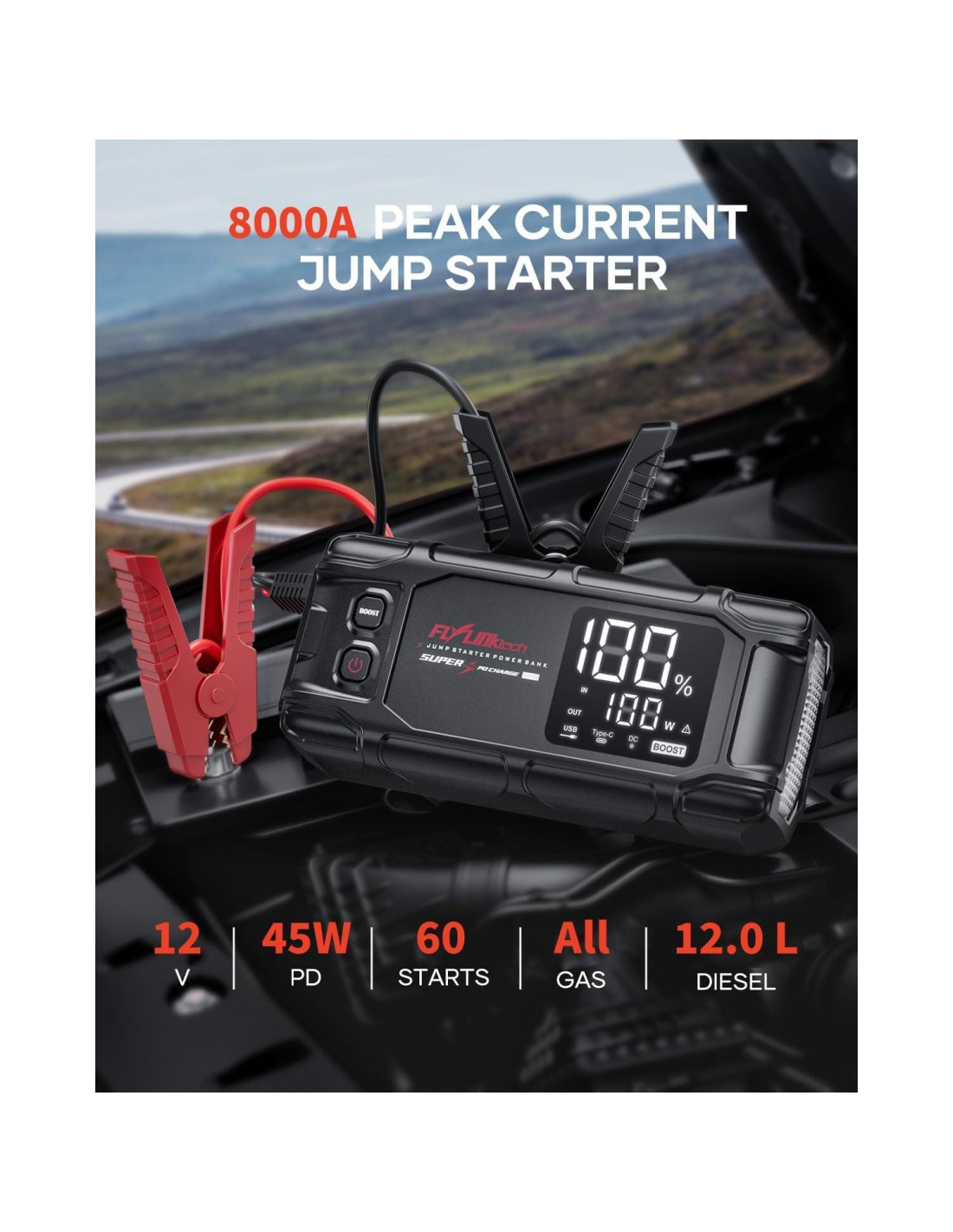 - Al presionar el botón "BOOST", el potente y seguro arrancador de batería de coche puede iniciar inmediatamente baterías de coche completamente descargadas o de bajo voltaje. 8000A de corriente pico y 26800mAh de arrancador de coche, especialmente adecuado para vehículos de hasta Todos los motores de gasolina/12L diésel, asegurando que nunca te quedes varado con una batería de coche muerta nuevamente.