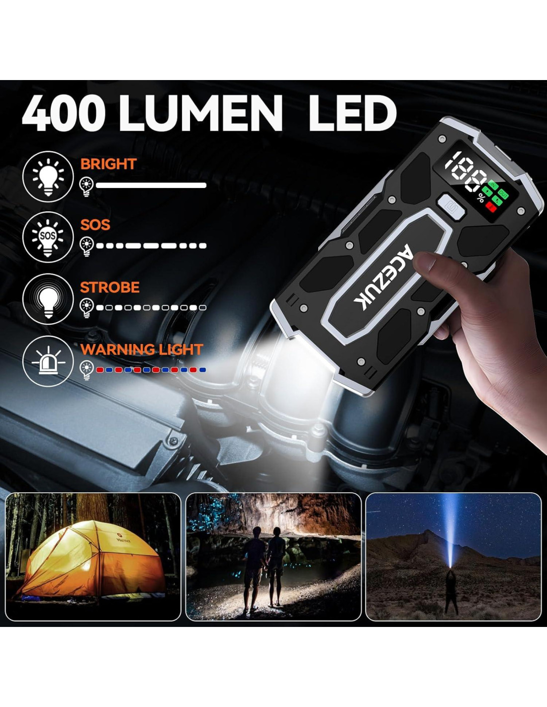- BANCO DE ENERGÍA PORTÁTIL - El arrancador de litio ACEZUK está integrado con 3 funciones. Es un arrancador de auto, banco de energía portátil, brújula, linterna de emergencia LED con 4 modos (Linterna, Estroboscópica, SOS, Advertencia). Está equipado con 2 puertos.