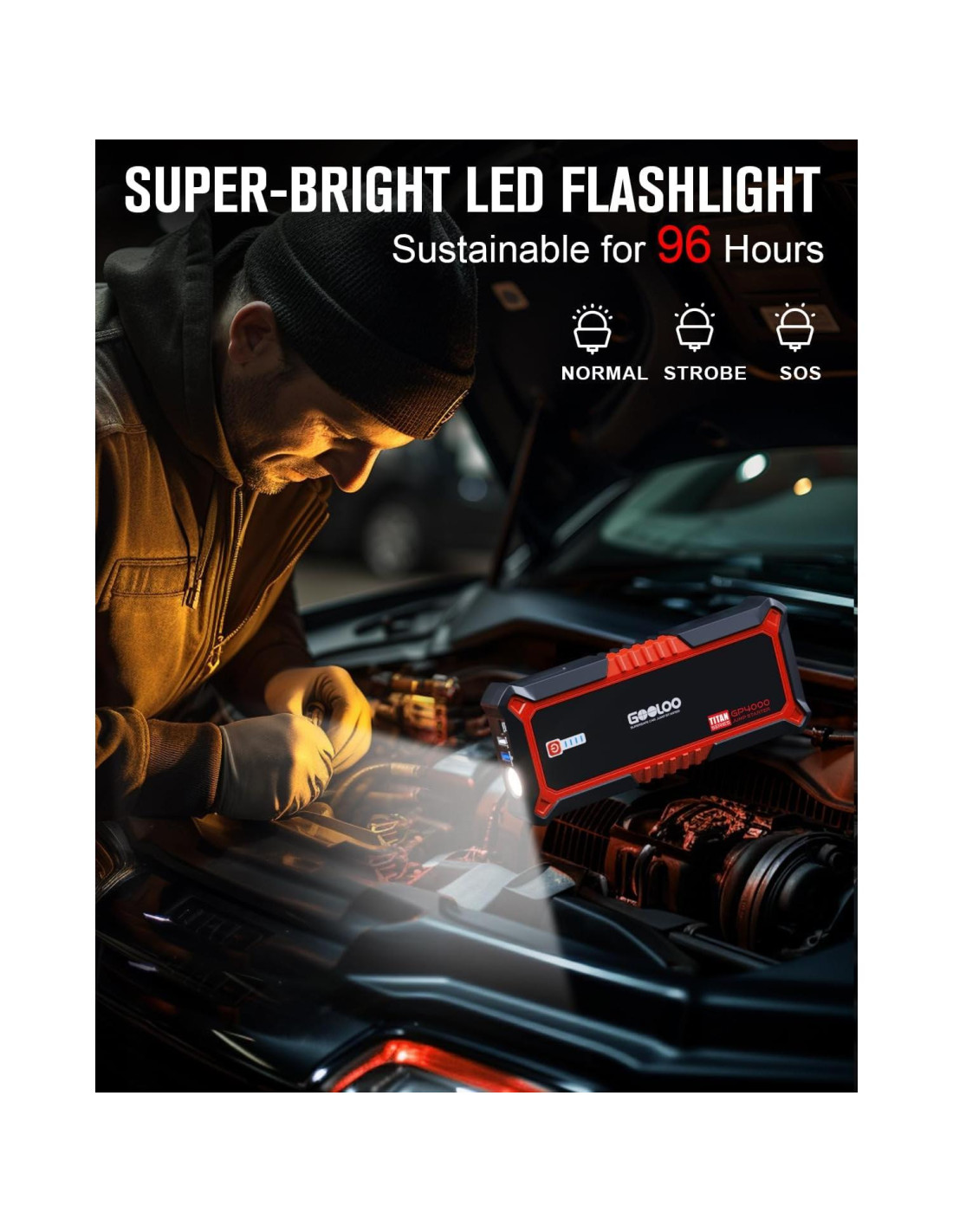 - Salvavidas de Emergencia - El arrancador de coche GOOLOO GP4000 proporciona capacidades rápidas de arranque de vehículos, asegurando que no estés varado y expuesto a peligros potenciales durante un período prolongado. Con una carga completa, puede arrancar la mayoría de los vehículos más de 60 veces, ofreciendo asistencia confiable en situaciones de emergencia.